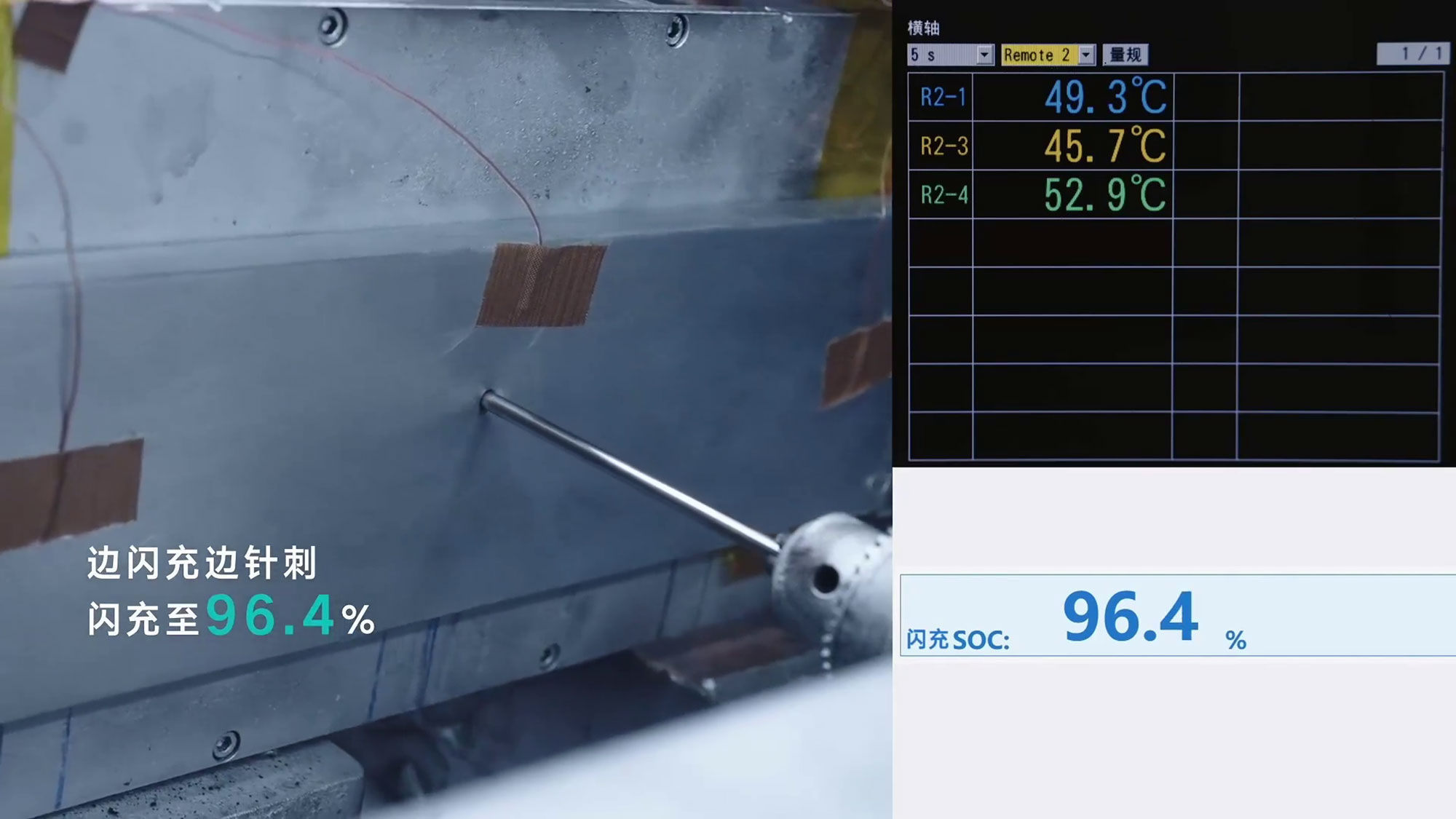 釘刺し試験そのものはこれまでも知られていましたが、今回はフラッシュ充電を500回フルに繰り返した後のバッテリーに対して、しかも充電中に釘刺し試験を行い、それでも温度の大きな上昇は見られなかったとしています。航続距離1,000km級の車両で考えれば、50万km以上走ったのに相当するバッテリーで試験したことになります。
