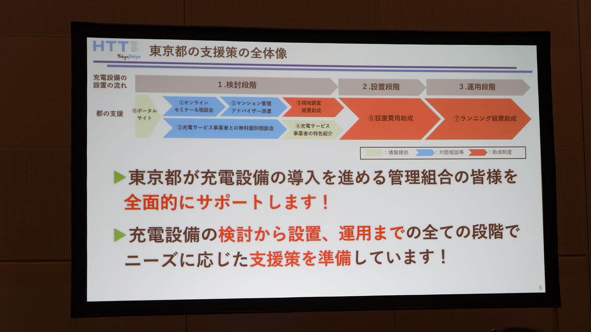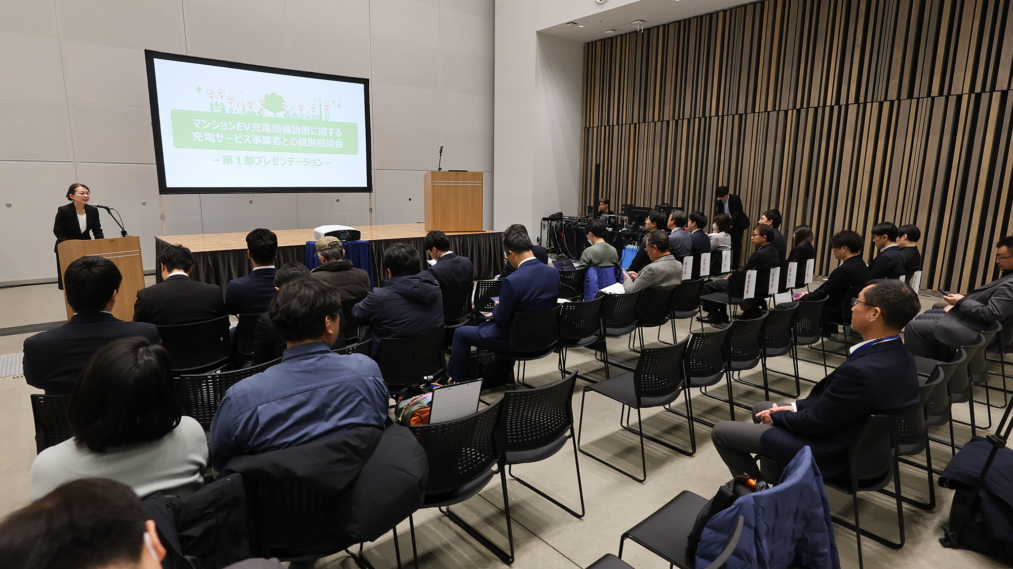東京都では、集合住宅にEV等用充電設備を2030年までに6万口、2035年までに12万口設置する目標を掲げており、さまざまな支援策や助成制度(補助金)を実施しています。この無料相談会は既設集合住宅(マンション)の管理組合や管理会社、オーナーなどを対象としたもので、都が用意しているマンションにおけるEV充電設備設置への支援、助成金などの内容を紹介するとともに、マンションでの充電設備設置に実績のある充電サービス事業者を紹介、個別ブースで無料相談をすることができる「マッチング」の機会を提供しています。