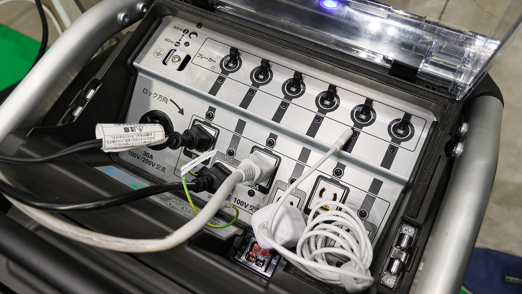 急速充電口からのV2Lに使用されていたのは、これも都の備品であるホンダ「Power Exporter 9000」という機器。実物を見るのは初めてでしたが、なんと、出力は「9kVA=9kW」というパワフルな1台です。操作部を覗いてみると、「100V/1500W」のコンセントがしっかり6つ並んでいました。ただし、現在は製造を終了していて、出力6kWの「Power Exporter e: 6000」になっています。余談ですけど、ホンダのEV関連製品はここでも「e:」推しなんですね。