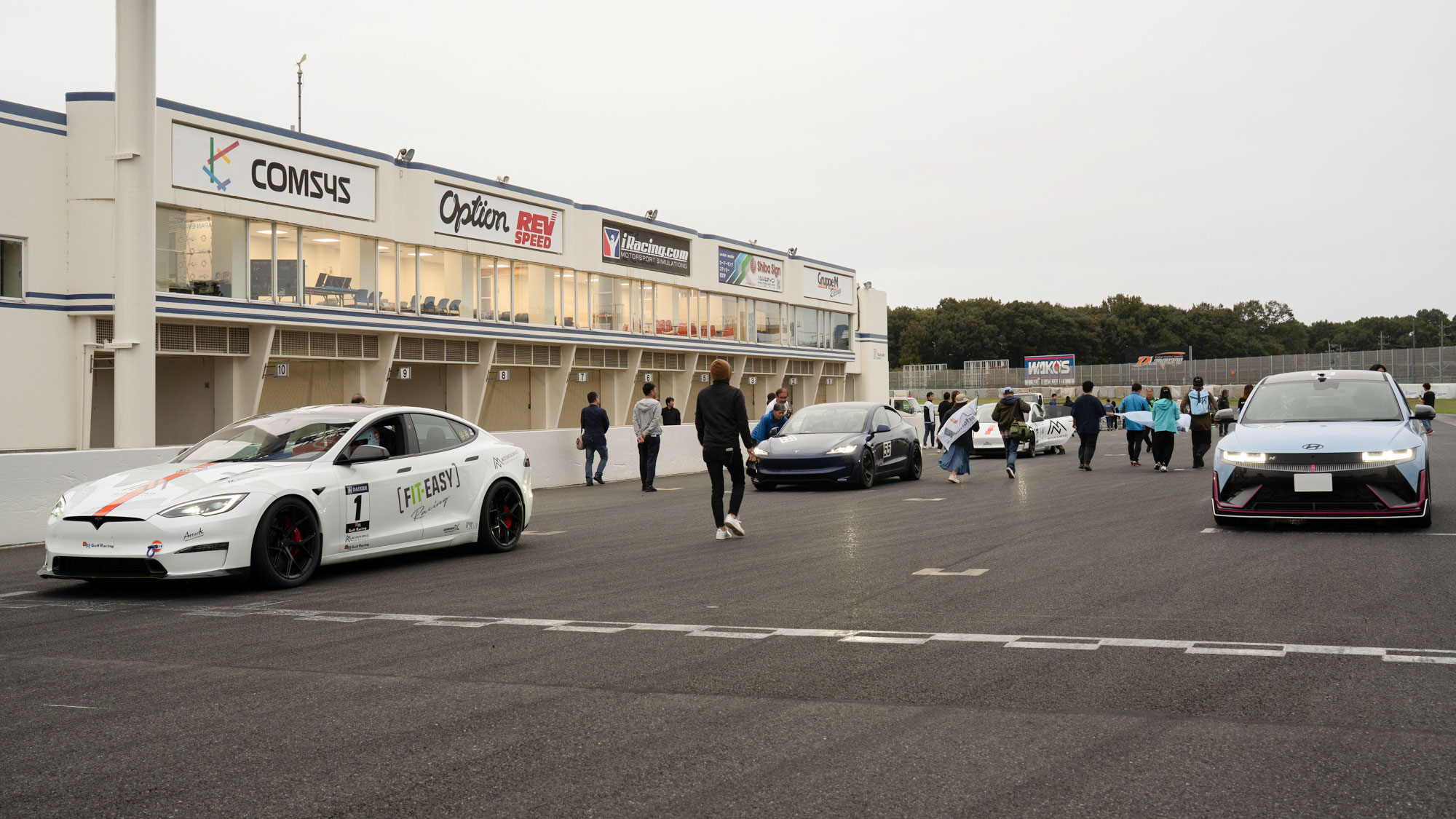 5番手にはTAHARA選手が入りました。以下、ジョー選手、井岡選手、泉選手、EV-R勢というグリッド順。タイム的にはテスラ勢に続いていたIONIQ 5 Nの冨田選手と柴田選手は、基準タイム(各クラスのトップ選手の110%以内)に達していなかったため、ともに後列スタートとなりました。