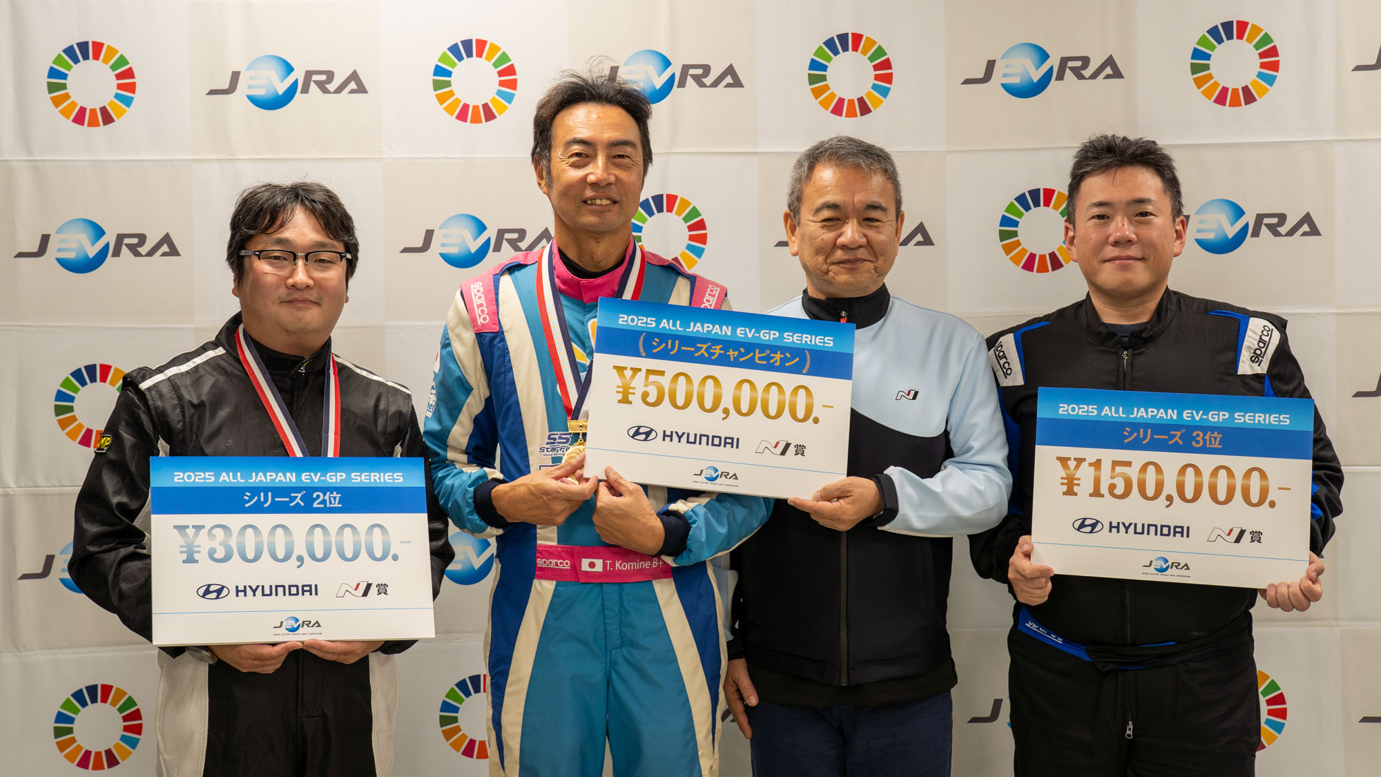 表彰式では、うれしいサプライズもありました。今シーズン、ヒョンデモビリティジャパン(HMJ)は自社の車で参戦するドライバーに「ヒョンデ賞」(各レースの上位入賞者に10万円〜3万円、シーズンのポイント上位者に50万円〜15万円)を贈呈していました。