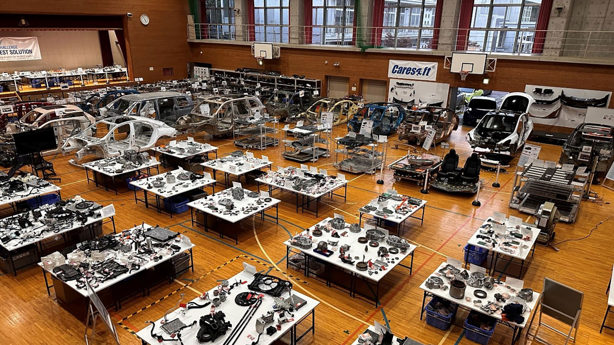 三洋貿易では岐阜県瑞浪市の廃校になった中学校の教室や体育館などを再利用したEVの分解展示場「Sanyo Solution Gallery」を開設していて、有料で展示物の見学ができるようになっています。展示されているEVは国内外合わせて25台、部品点数にして13万点(2025年6月時点)という膨大さ。希望する企業などが独自に利用するほか、公的機関が主催する勉強会などで利用されています。