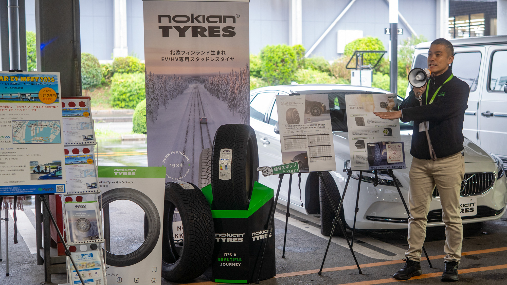 会場内では、フィンランドに本社を置くタイヤメーカー「ノキアンタイヤ」がEV専用スタッドレスタイヤを展示していたり、オートバックスがプライベートブランド「AQ. オートバックス クオリティー」のテスラ向け商品を販売したり、小型電動モビリティの試乗も行われていました。