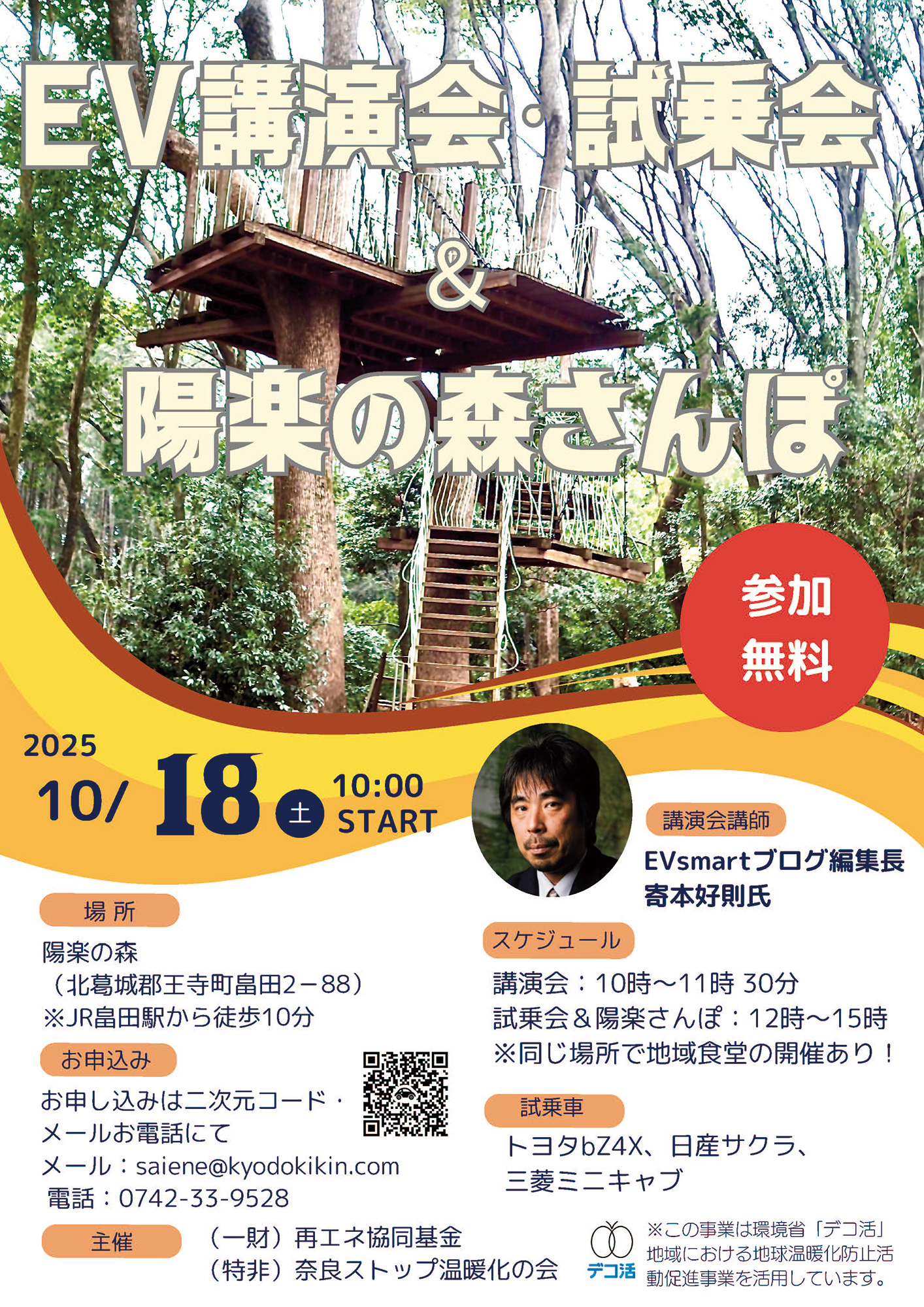 2025年10月18日(土)、奈良県王子町と上牧町に広がる「陽楽の森」で、一般財団法人 再エネ協同基金と、NPO法人 奈良ストップ温暖化の会が主催する「EV講演会&試乗会」が開催されます。