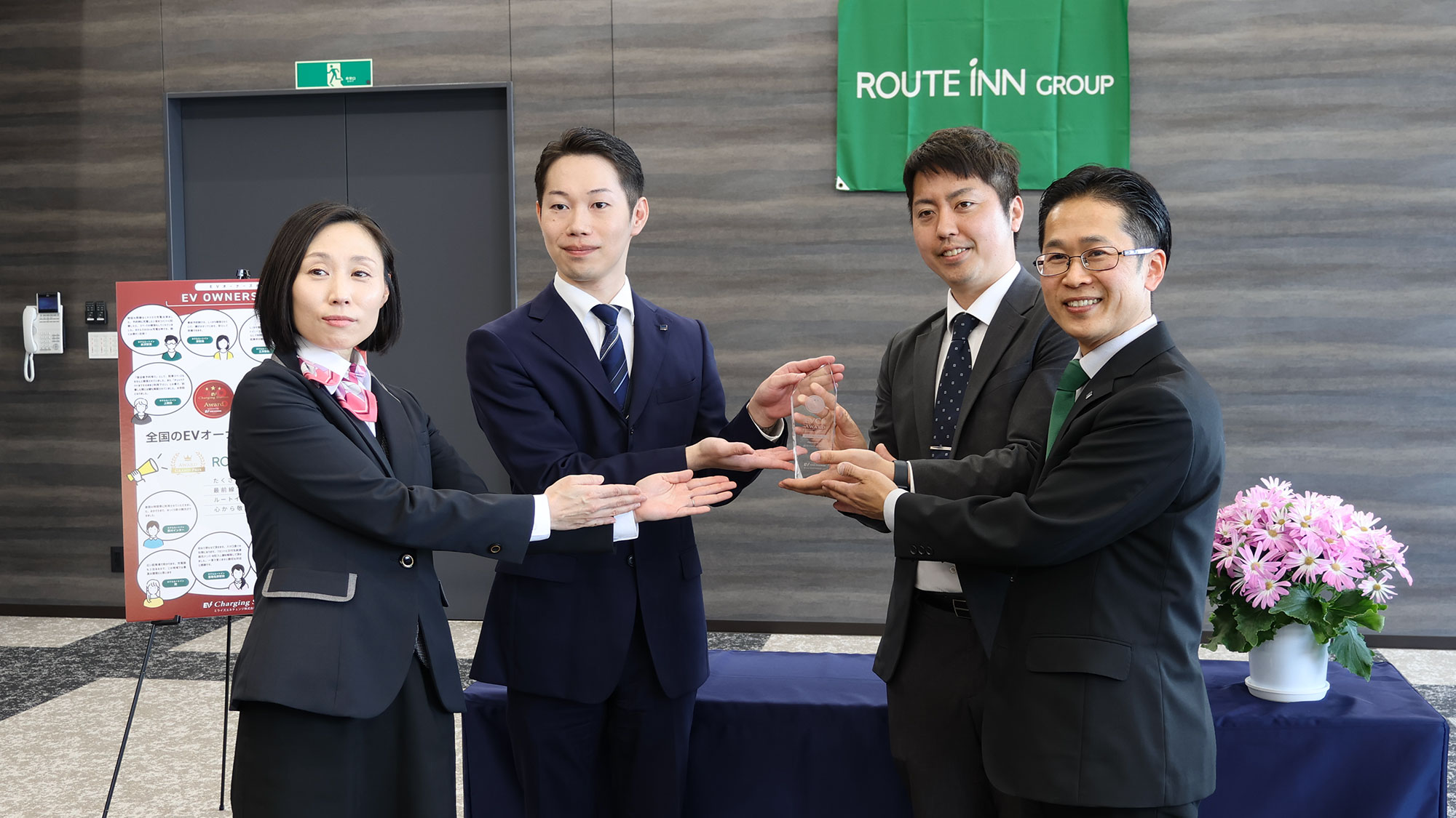 トロフィを贈呈。写真左から、ルートインジャパン運営管理課の峯村三枝さんと同課副主任の魚田翔耀さん、ミライズエネチェンジの担当者である大野広輝さん、ルートインジャパン運営管理課長の大竹伸さん。
