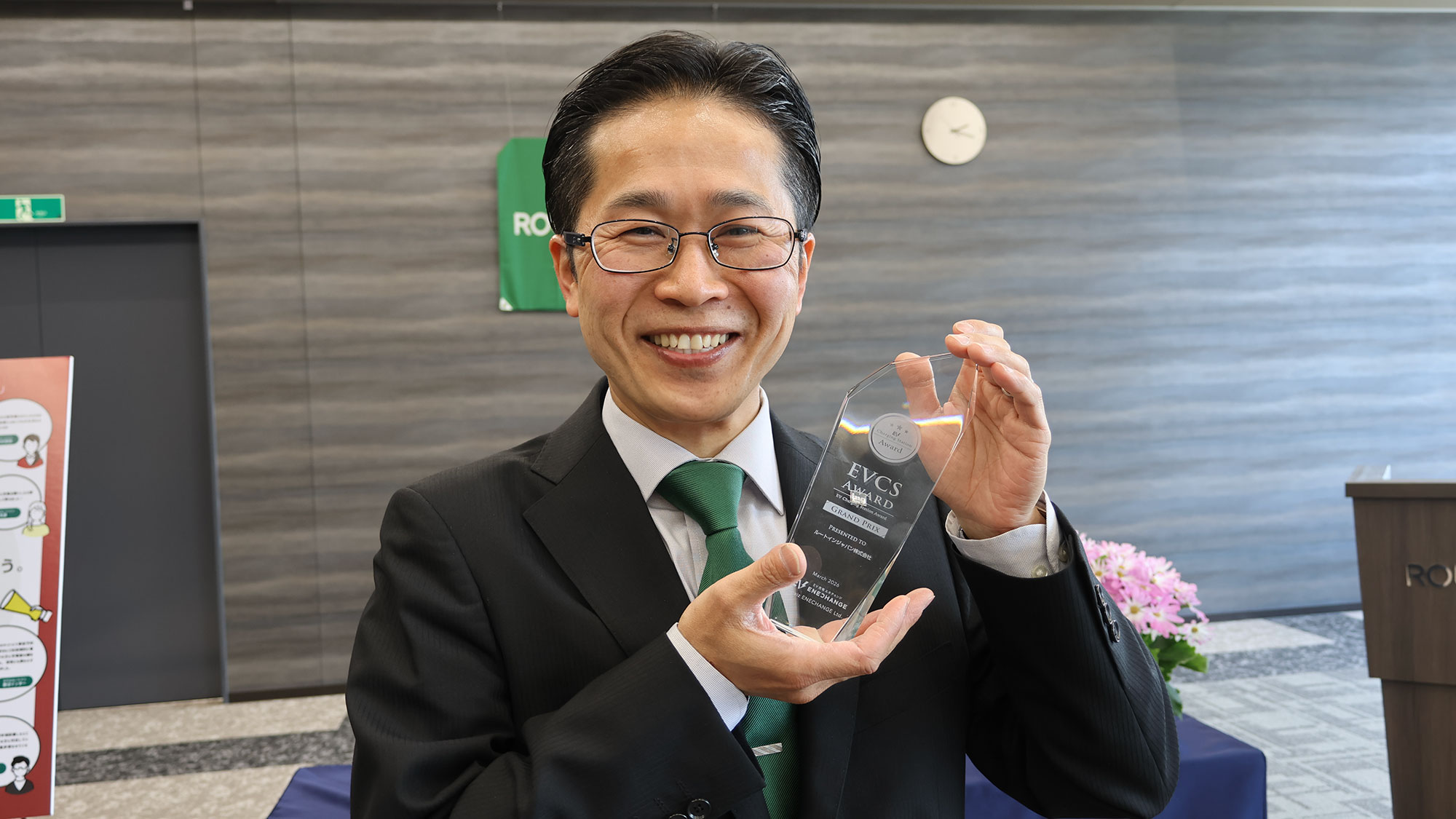 表彰セレモニーの終了後、ルートインジャパンで店舗へのEV充電器設置や運営を担当する運営管理課の大竹伸課長、副主任の魚田翔耀さん、充電器設置前後の詳細確認などを担当している峯村三枝さんにインタビューを行いました。