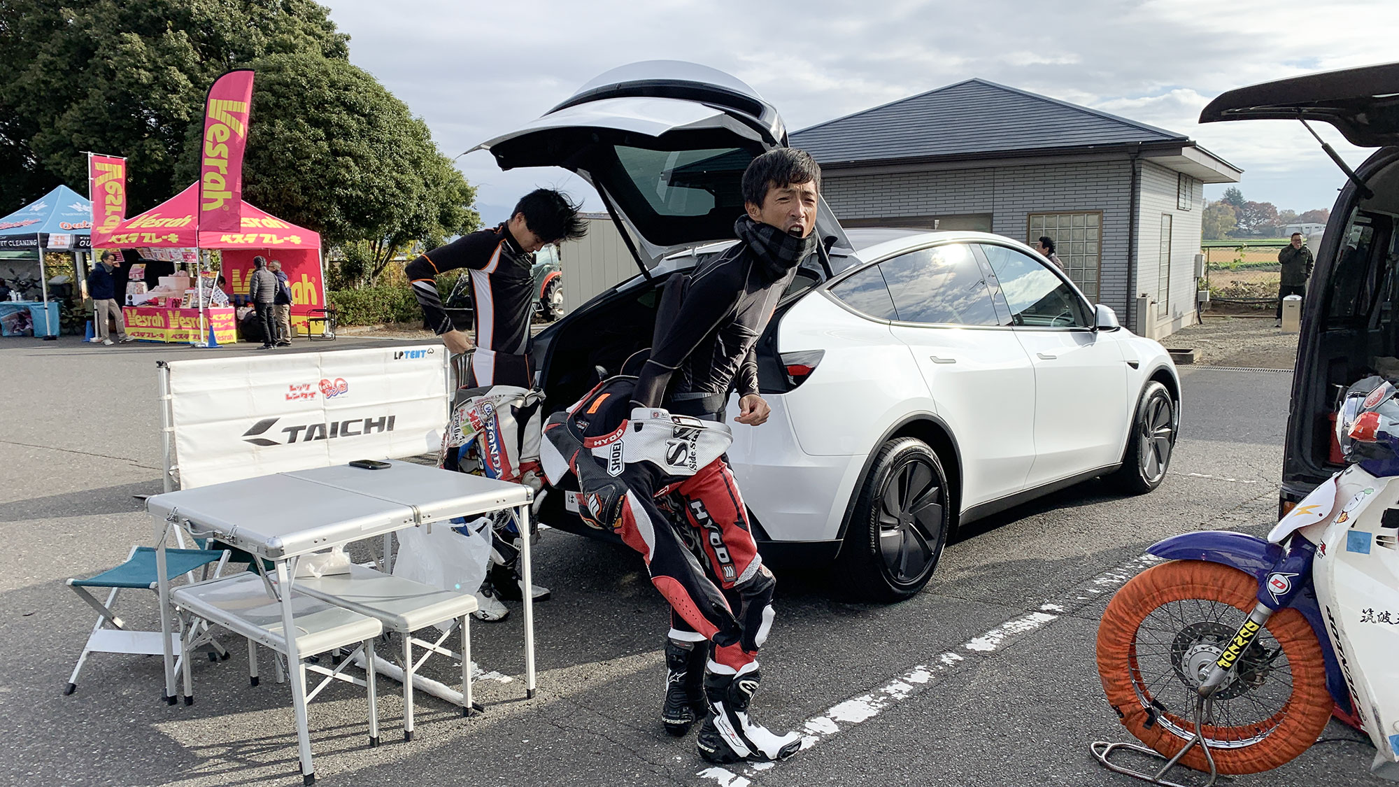 新しいマイカーのモデルYで筑波サーキットでのレースにやってきた治親選手。