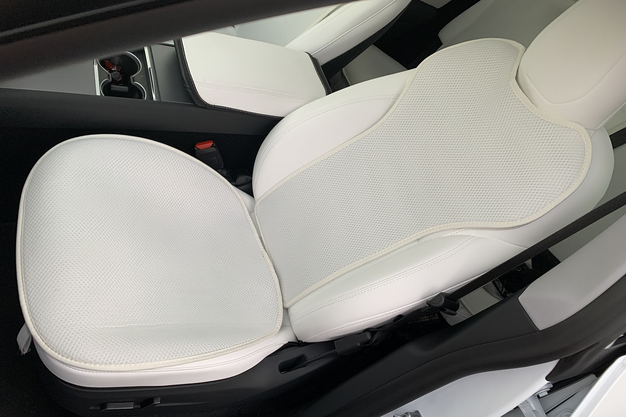 世界チャンピオンがチョイスしたモデルYのボディカラーはパールホワイト、19インチ クロスフローホイールに、ブラック/ホワイトインテリアとなっています。とくにカスタマイズなどはしていませんが、センターコンソールのボックスが深いので専用トレーを購入。また「シートが汚れそう」という奥様の指摘でシートカバーを装着しています。