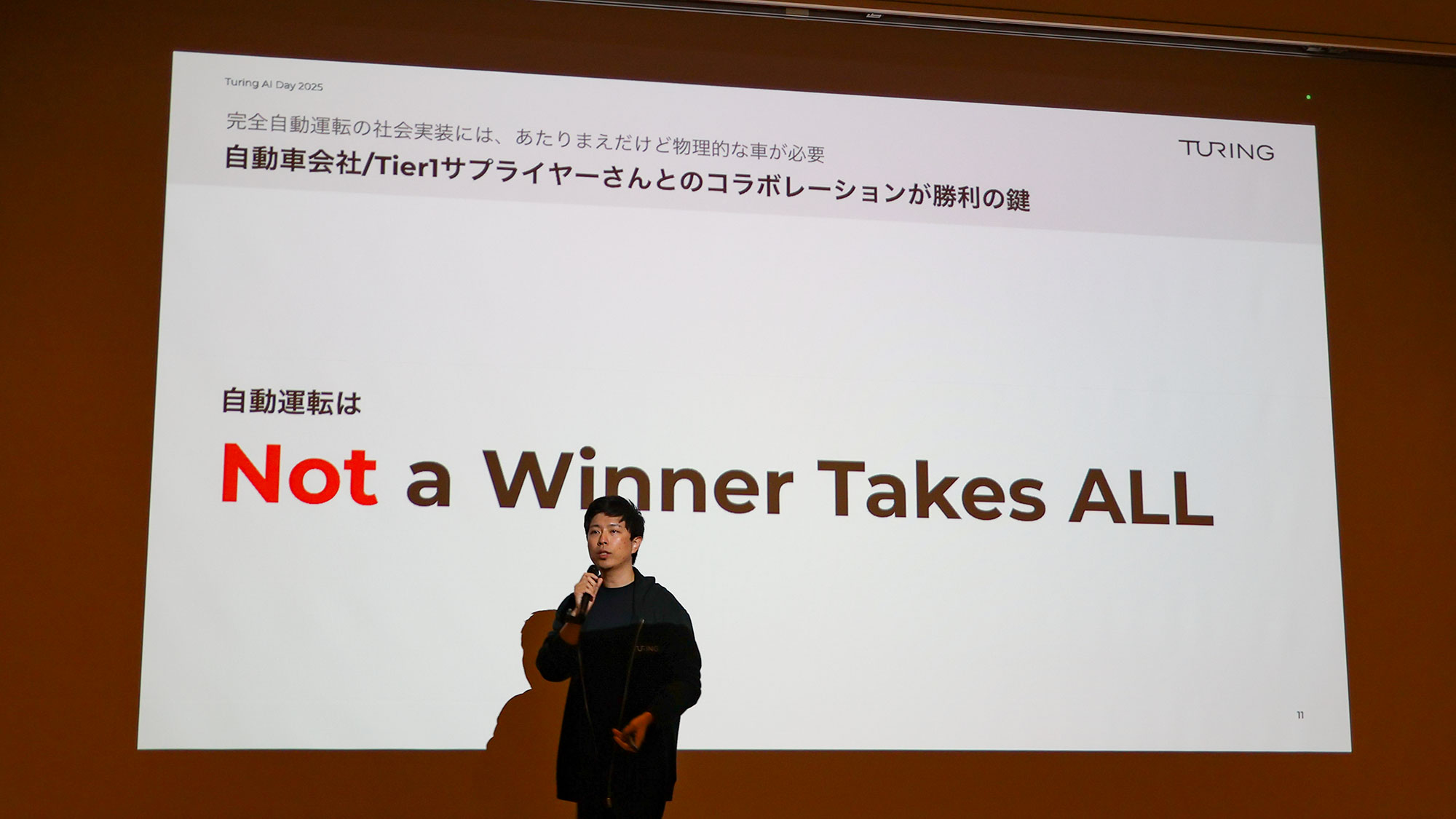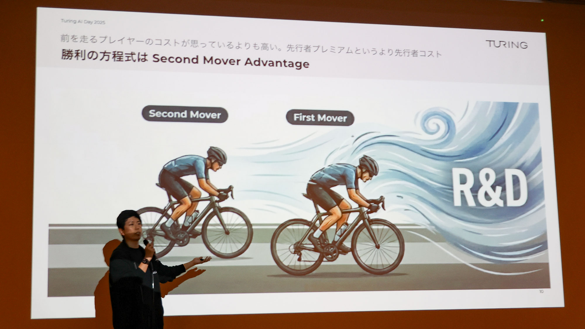 もうひとつ印象に残ったのが、これも山本一成CEOが示した「Second Mover Advantage」というキーワードです。E2E自動運転の実現に向けて世界の先頭を走っているのはテスラです。山本氏は「テスラがとんでもなく先を行っており、我々はそのテスラにどう勝つかという話をしている」として「Second Mover Advantage」という言葉を示しました。