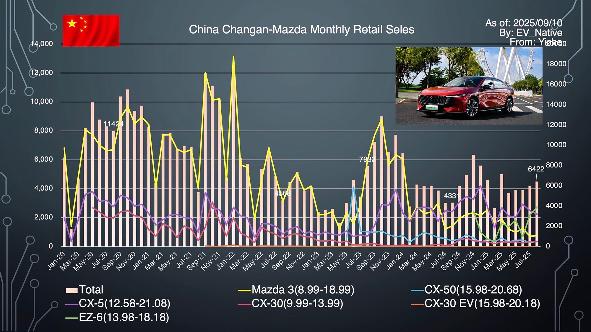 まず、中国市場におけるマツダの販売動向を確認しておきます。マツダの2025年1〜8月の累計販売台数は4万6430台と、前年同期比+2.3%と、わずかながらも成長を実現しています。とはいえ8月単体の販売台数では、2020年8月に記録していた約1万1000台から減少しており、2025年8月は6422台となって販売規模がほぼ半減という苦しい状況です。