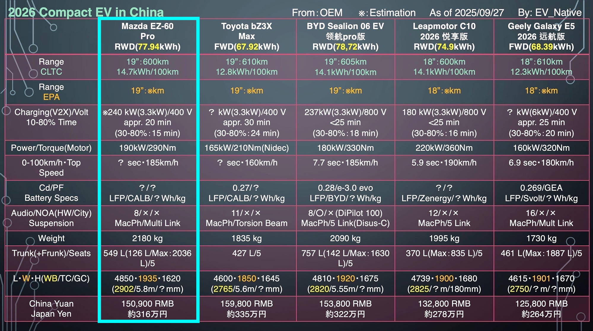 この表はEZ-60の競合となるトヨタbZ3X、BYD Sealion 06、Leapmotor C10などの大衆的電動SUVと比較したものです。やはり先に指摘した通り、最適化が甘いのか電費は最も悪いものの、航続距離は600kmを確保しており競合と同等水準です。また急速充電性能はセグメント最速を達成することに成功しています。また全車種LFPを採用しており、もう80kWh程度であればLFPを使用するのが当然となっている様子が見て取れます。