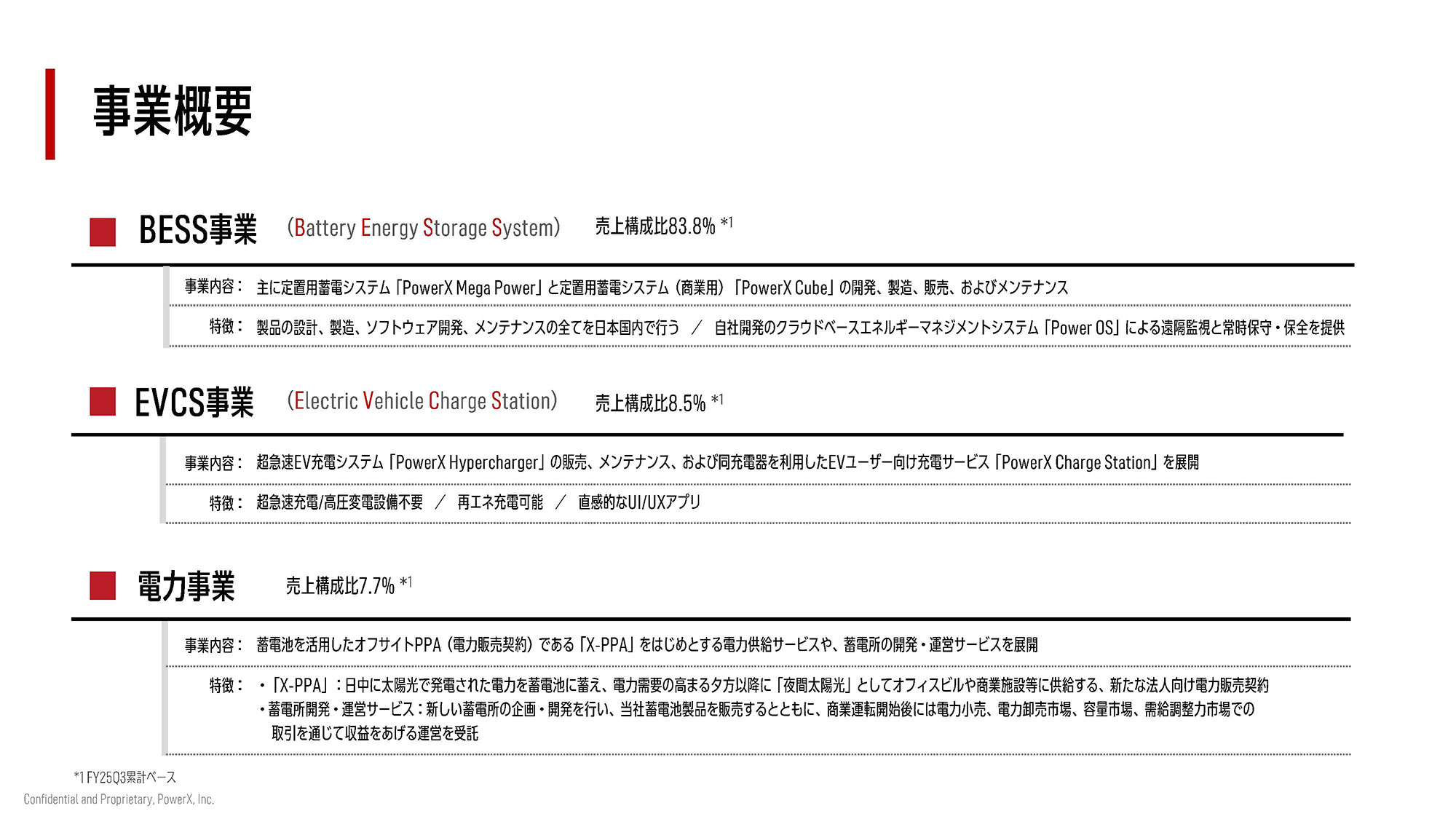 セレモニー後に行われた記者会見の「事業計画及び成長可能性に関する説明」では、BESS(Battery Energy Storage System=定置用蓄電システム)事業が売上構成比の83.8%(2025年3月累計ベース)を占めていて、EVCS (Electric Vehicle Charge Station=EV充電ステーション)事業の売上構成比は8.5%であることが示されました。