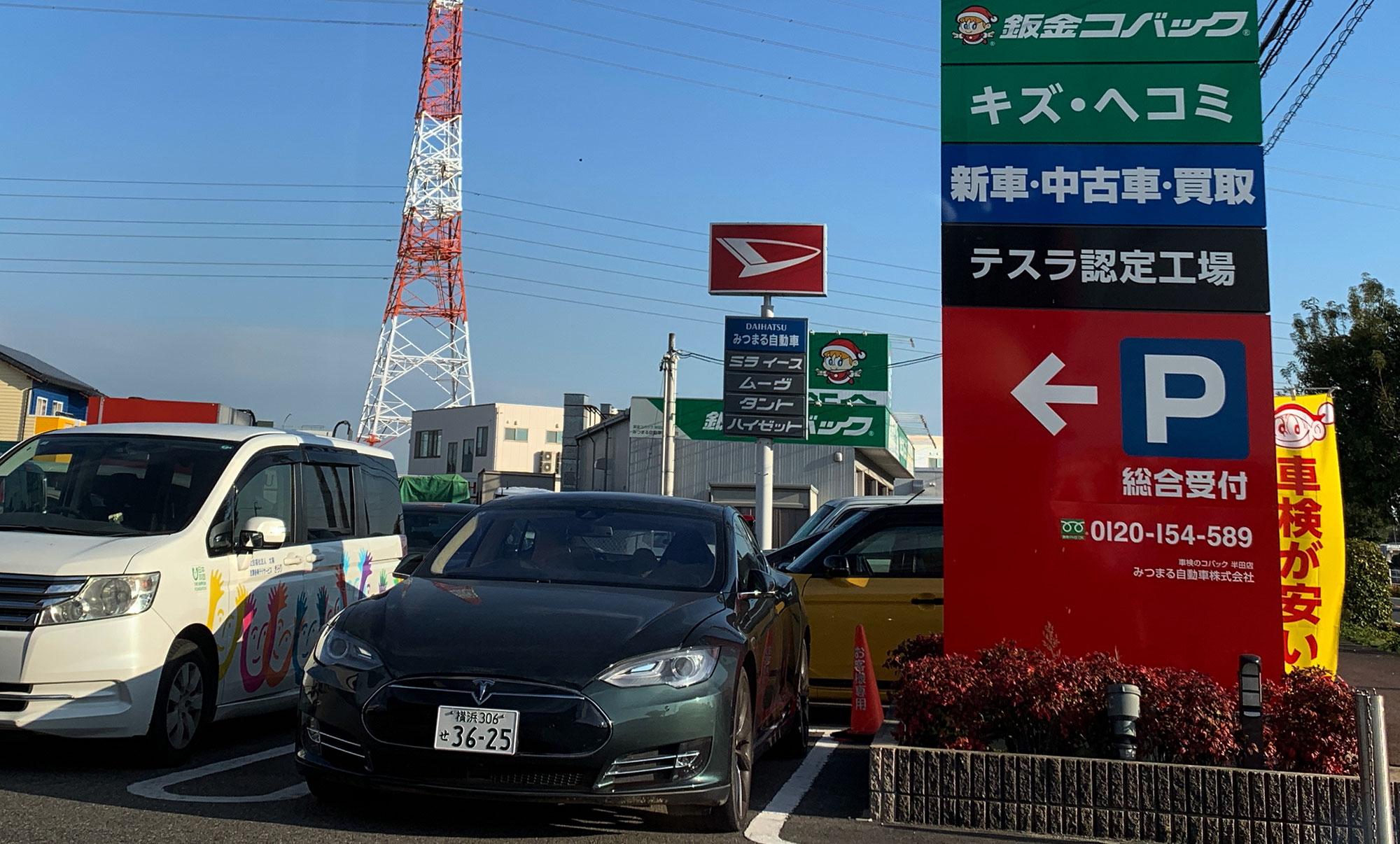 到着したのは「車検のコバック」でした。よ~く見ると大きな看板の一部に「テスラ認定工場」とあるので、間違いなし。テスラのサービスセンターとどっちがいいのか? とは思いましたが、よくわかりません。テスラの看板か、修理技術の腕前か。自分の運にかける、という感じですね。