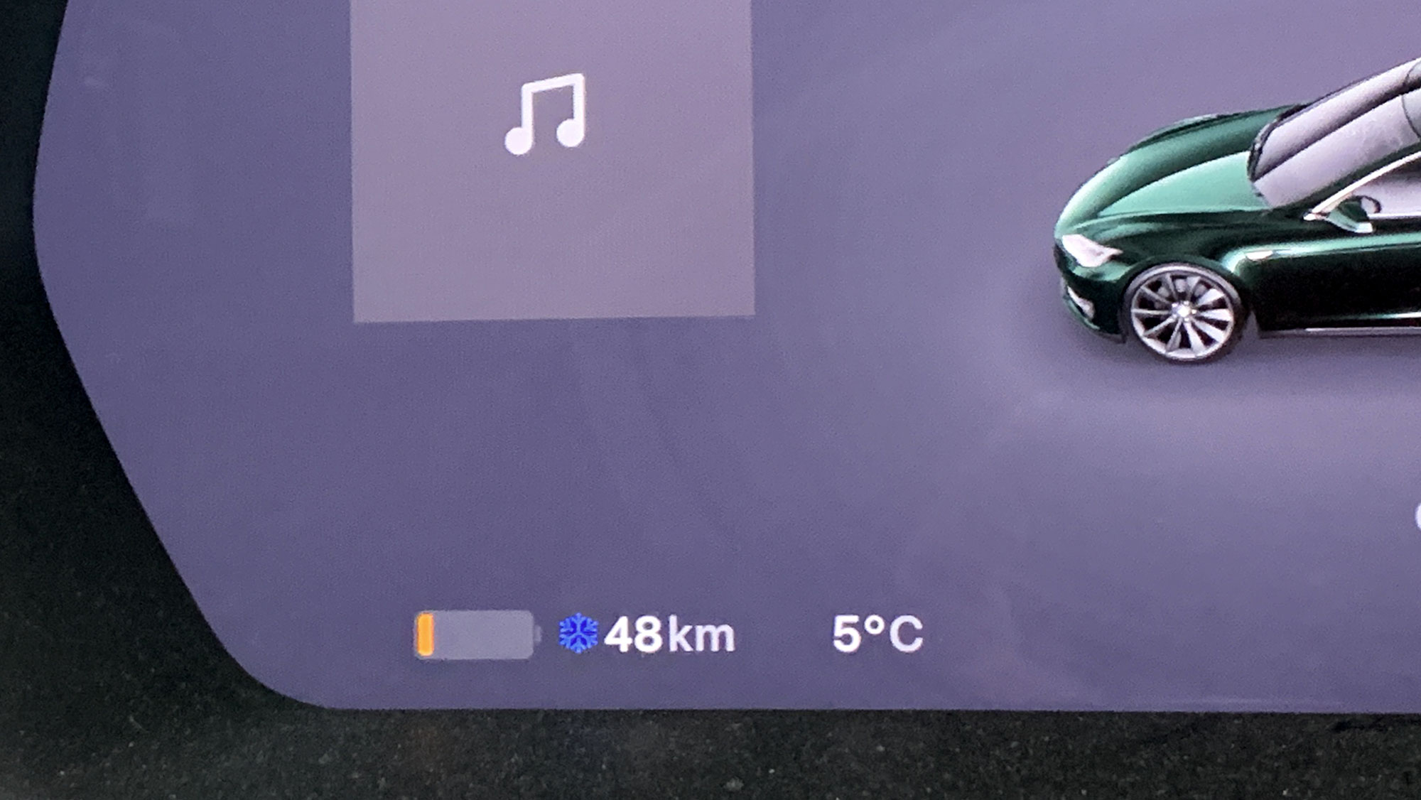 そして入庫直前、28日間のスリープから目覚めさせたモデルSですが、走行可能距離表示は48kmまで減ってました。さらに見たことのない「雪」のマークもあって、2度びっくりでした。すぐに充電を開始して事なきを得ましたが、やむを得ず放置する場合はAC電源につないでおくことを改めて反省。