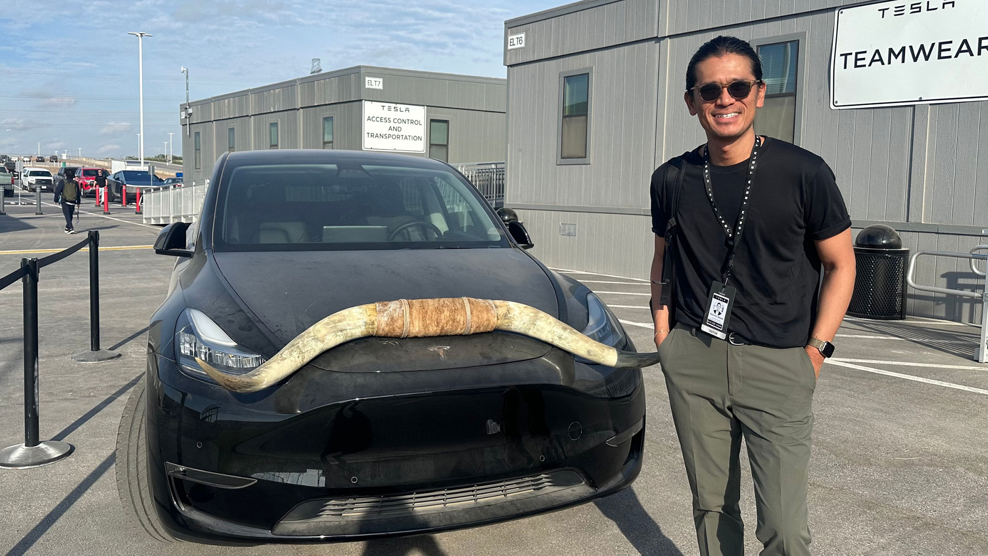 工場のゲスト受付の横のスペースには、ギガ・テキサスが開業イベント「サイバー・ロデオ」のプロモーションで使った「Texas Long Horn Model Y」や、初代ロードスター、サイバートラックなどが展示してあり、ギガ・テキサスの歴史とカウボーイ文化を感じ取ることができた。