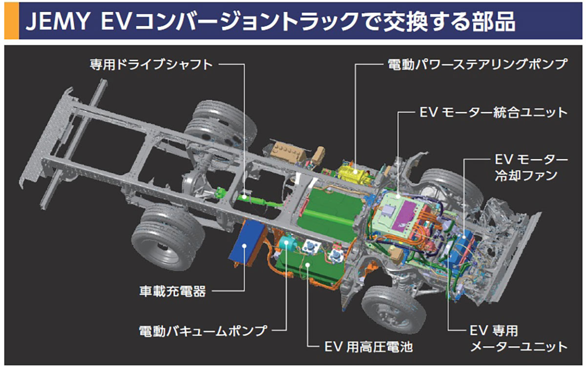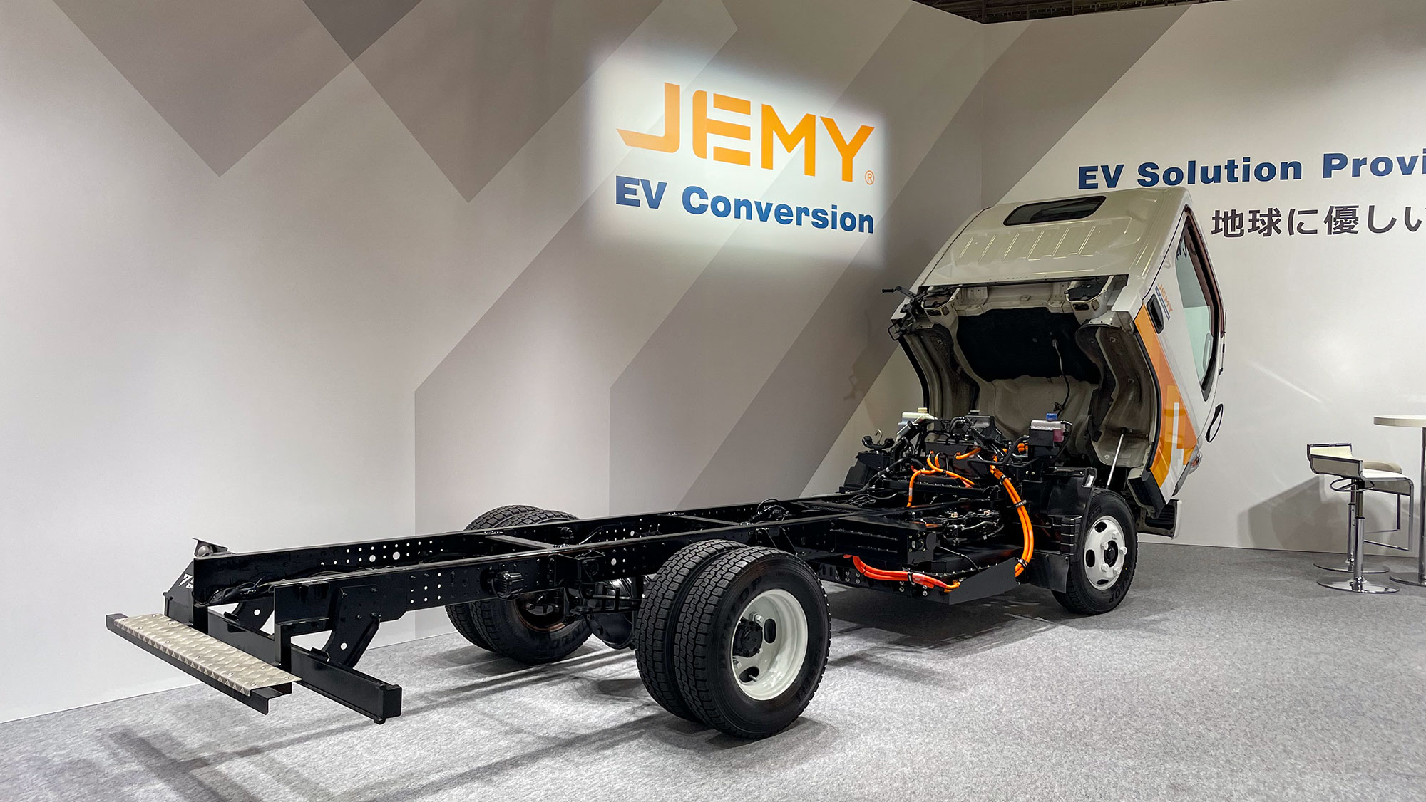 今回の目玉は、そのJEMYブランドで開発を進めてきた、旧型キャンターのディーゼル車をEV化する「リユースEVトラック」だった。実は、この改造EV開発には、筆者も技術的なアドバイスや、改造車としての複数台認証の取得支援で関わってきた。