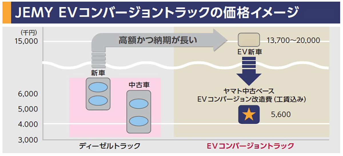 JEMYの事業コンセプトは明快だ。新車EVはまだ高価。そこで、企業が使い慣れたディーゼルトラックのエンジン寿命が来たタイミングで、買い替えではなく車両をEVに「改造」して再利用する。開発はIATが担い、最適な中国製部品の調達まで含めてヤマトモビリティに供給するため、コストを大きく抑えられる。新車EVトラック導入の約3分の1のコストでEV化が可能——つまり新車1台分の予算で、3台のEVトラックを走らせられる計算だ。しかも既存車両の車体・架装・運行管理システムはそのまま活かせる。