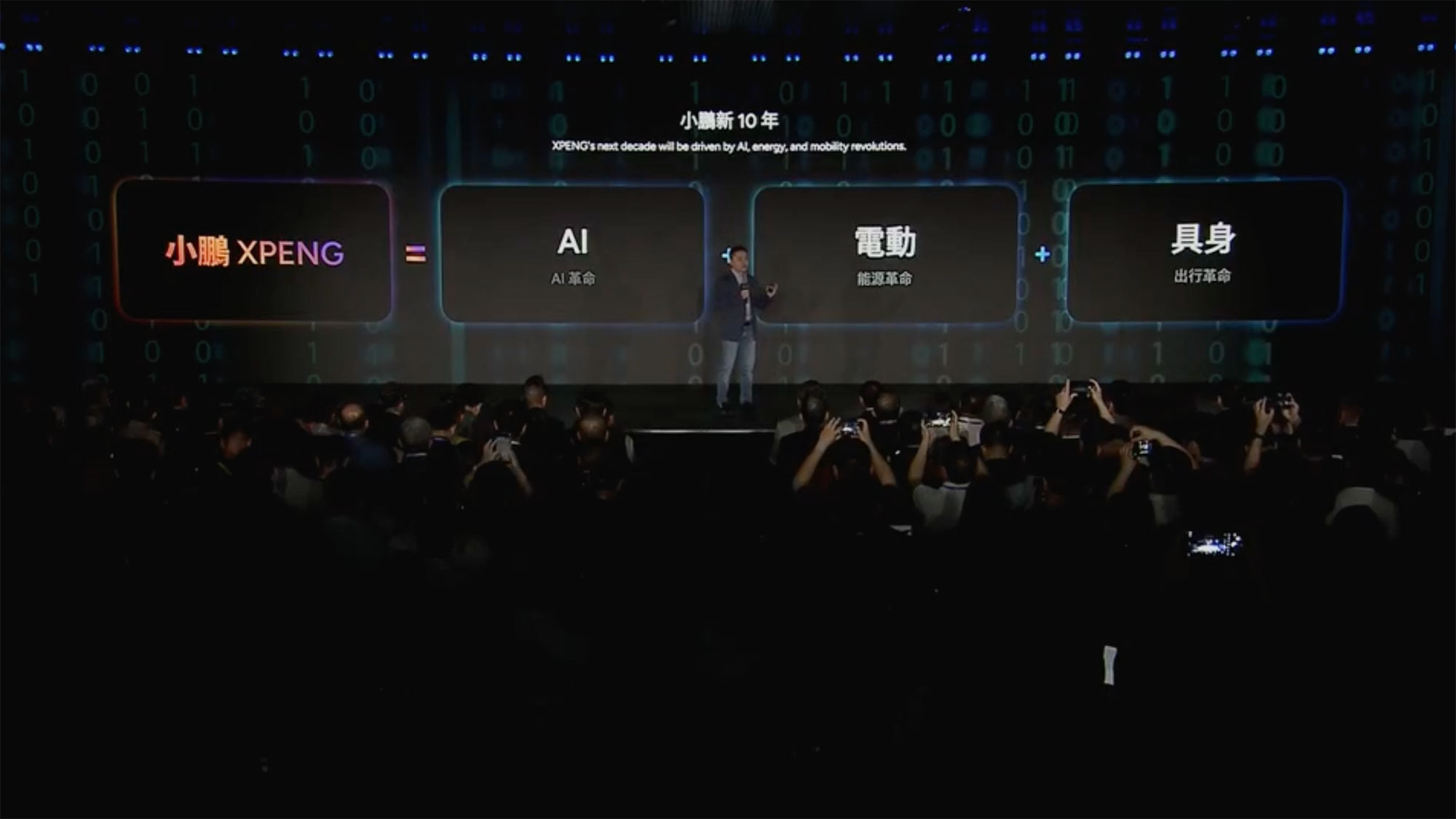 何小鵬CEOが次に説明したのが、現実世界AIへの注力だ。AIがモビリティを超えた新しい生活様式を生み出すエネルギーと位置づけ、AIが過去の蒸気、電気、インターネットに続くパラダイムシフトを引き起こし、物理世界とデジタル世界を融合させる。そしてXPENGはこの最前線にいると強調していた。