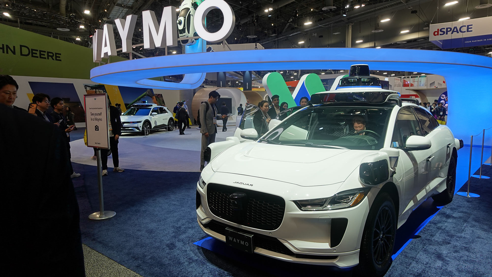 CES会場では、3台の自動運転タクシーが展示されていました。現在運行中のJaguar I-PACEとHyundai IONIQ 5に加え、I-PACE生産終了を受けた次期車としてZEEKR OJAI(ジーカー オハイ)が並び、いずれもEVです。特筆すべきは、I-PACEが第5世代のWaymo Driver(自動運転システム)を搭載しているのに対し、IONIQ 5とOJAIには第6世代へと進化したシステムが搭載されている点です。