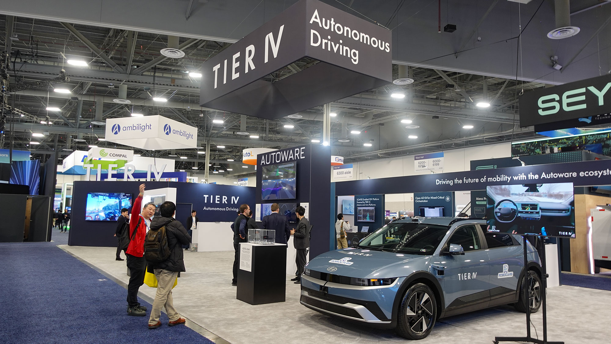 日本発の自動運転ベンチャーTIER IVが、今年も連続出展していました。今回は左ハンドルの Hyundai IONIQ 5 をベースにレベル4仕様へ改造した車両を展示し、雪道でのテスト走行動画でその技術力をアピールしていました。