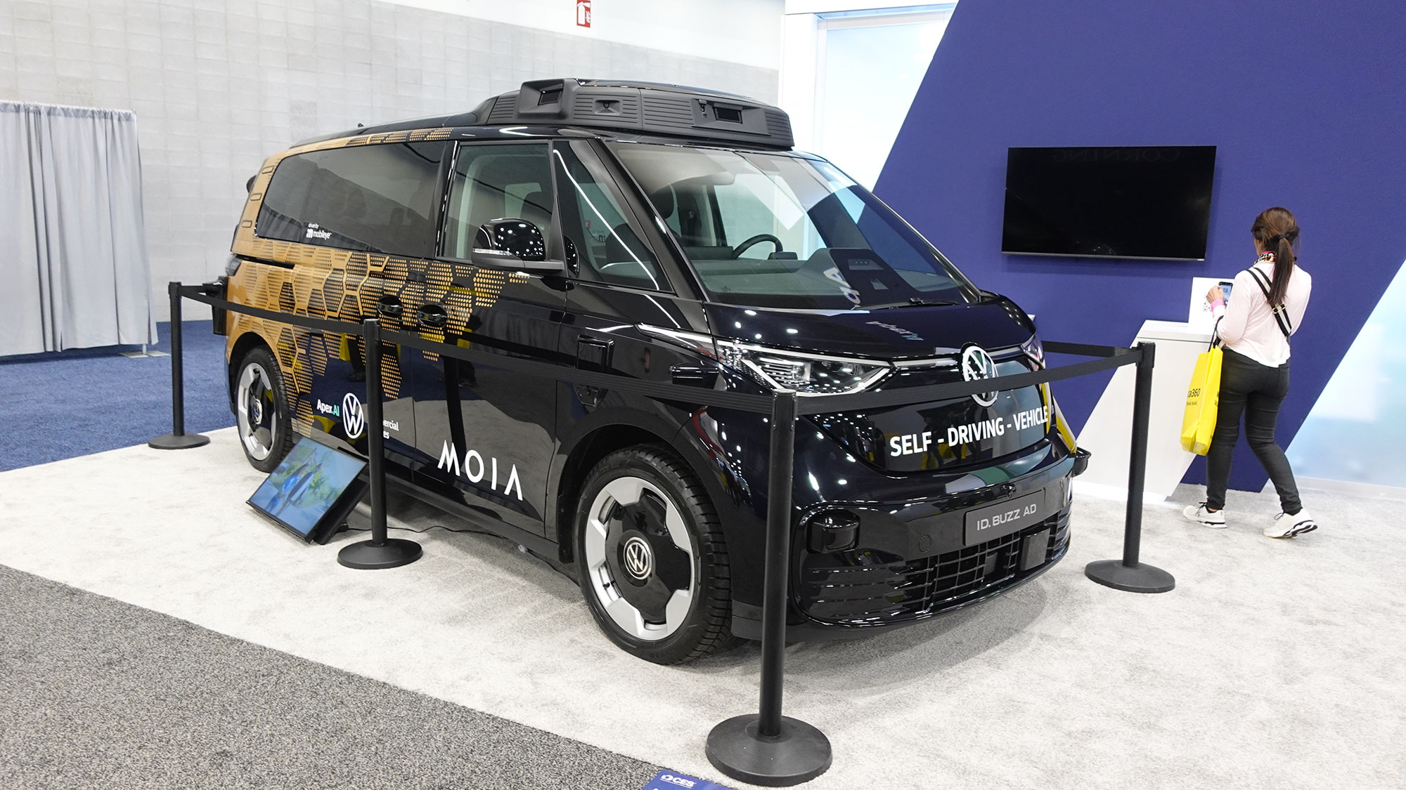 昨年までイスラエルのMobileyeブースに置かれていたVWのMaaS車両(およびサービス名称)である「MOIA」は、今年は自動運転オペレーションシステムを手がける米国のApex.AIブースに展示されていました。VW ID. Buzzをベースにしたレベル4自動運転シャトルで、テキサス州オースティンでの試験運行が進行中です。