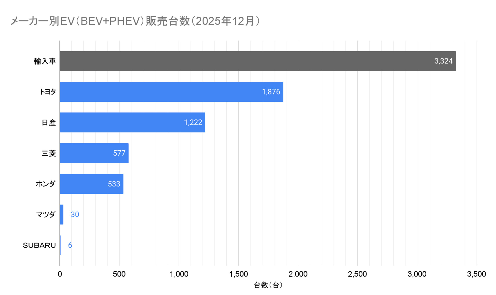 メーカー別の販売台数では、輸入車の合計が3,324台となり、2025年として10回目の最多を記録しました。国内メーカーの首位は1,876台を販売したトヨタで、このうちbZ4Xが762台を販売し、前月に続き車種別のTOP50にランクインしました。国内メーカーの2位は1,222台を販売した日産、3位は577台を販売した三菱、4位は僅差で533台を販売したホンダとなりました。