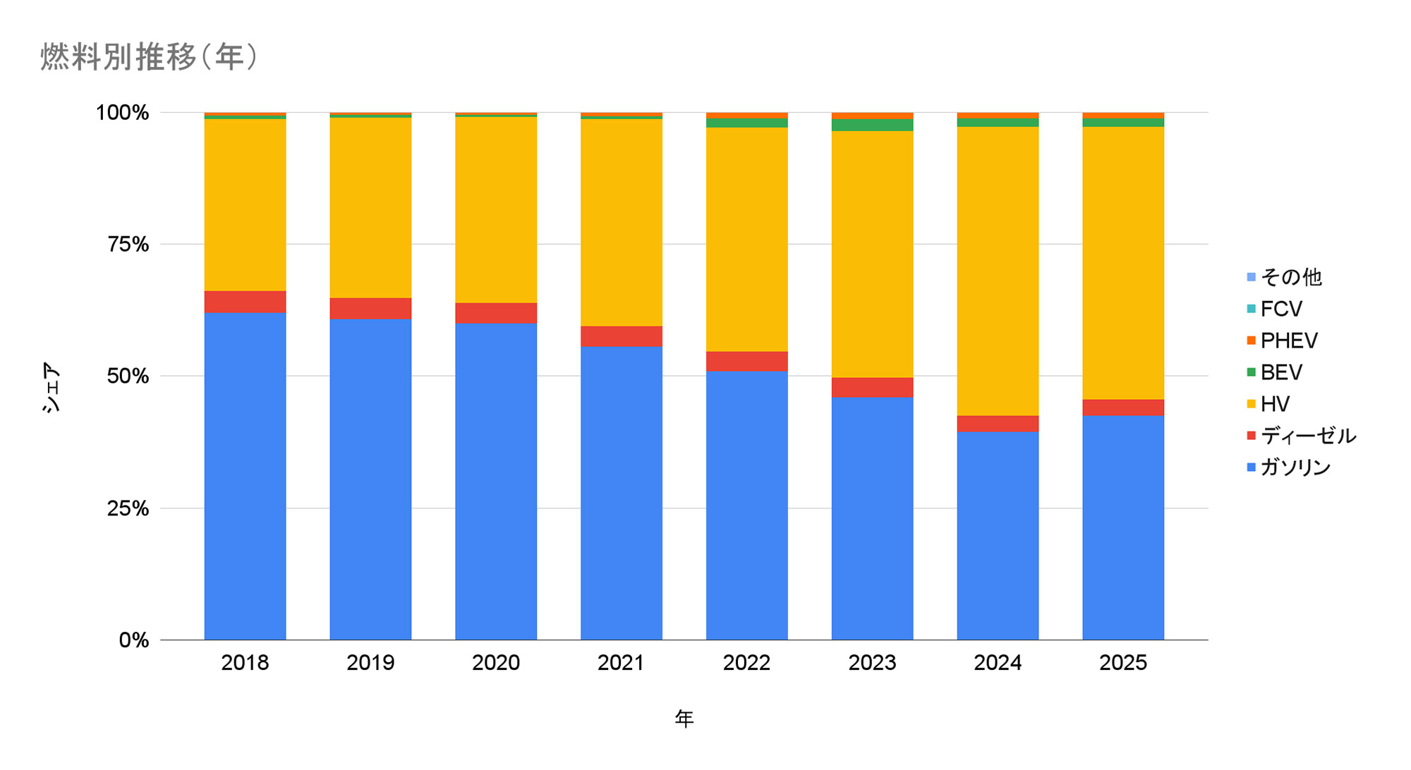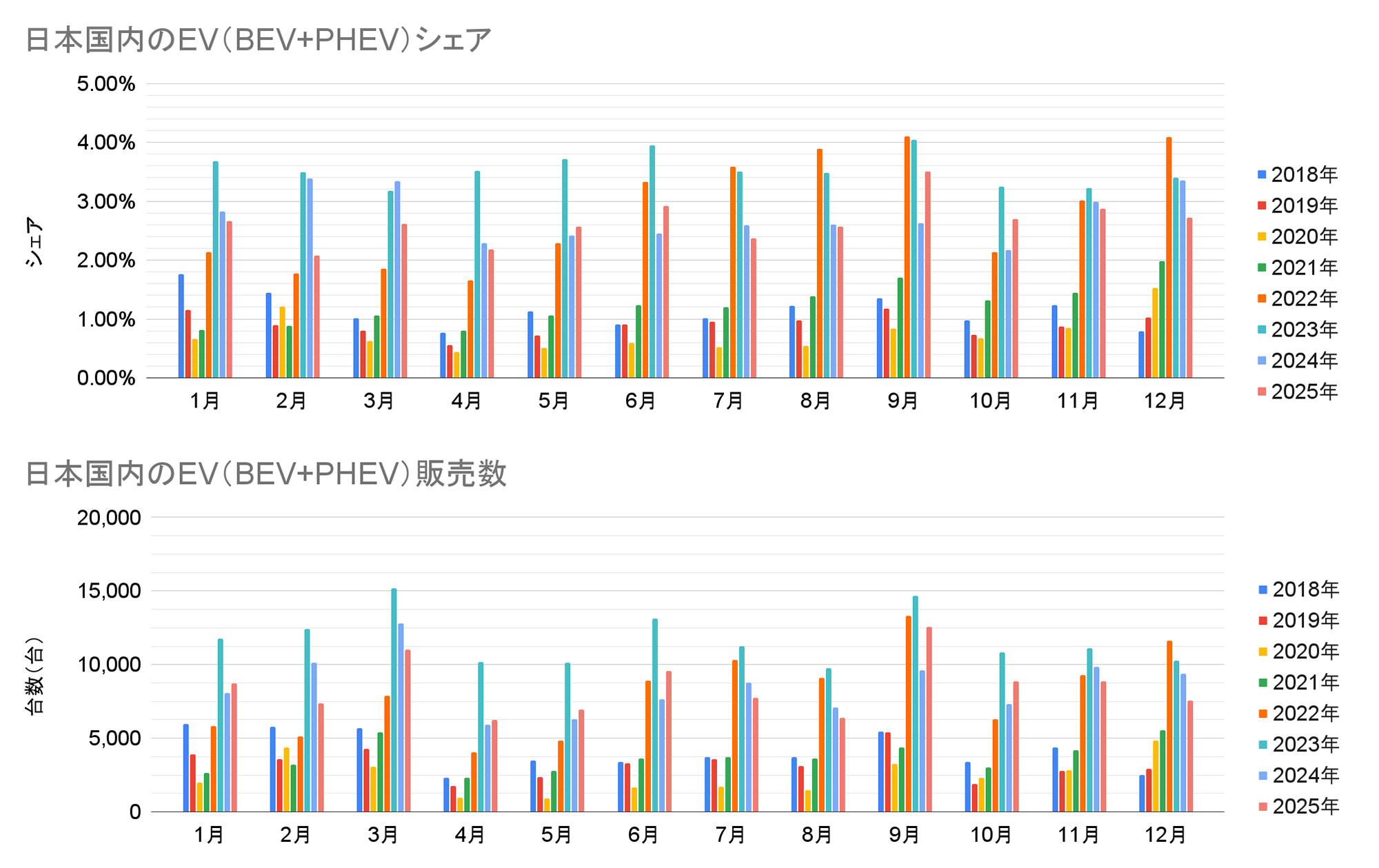 燃料別販売台数シェアについて、2018年からの月別推移と年推移を一覧できるグラフにしました。