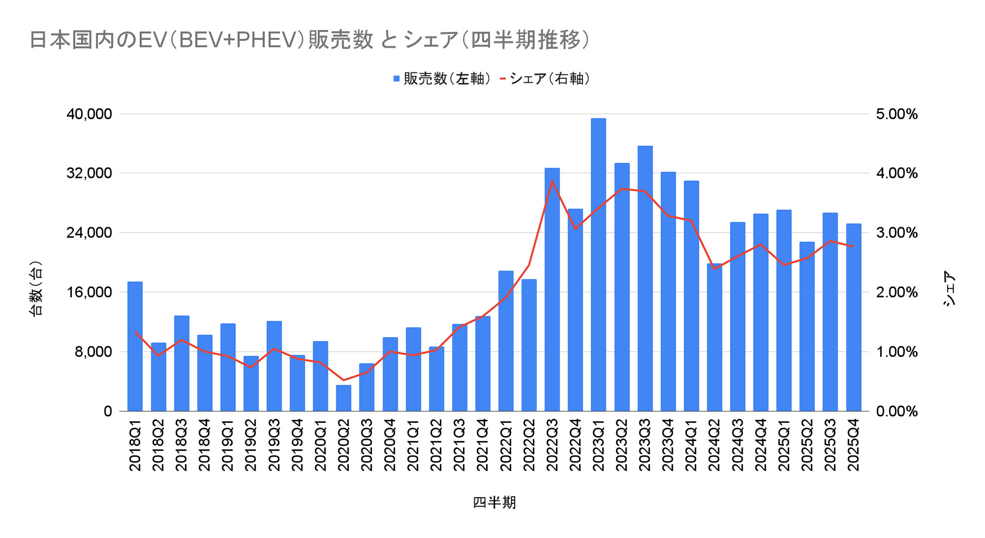 欧州や中国などを中心に、世界ではEVのシェアが急拡大しています。日本国内では長年普及が停滞。2022年の軽EV発売で一時拡大傾向となりましたが、最近は再び停滞気味になっています。この記事では日本国内の電動車販売シェア動向に着目し、定期的に更新していきます。