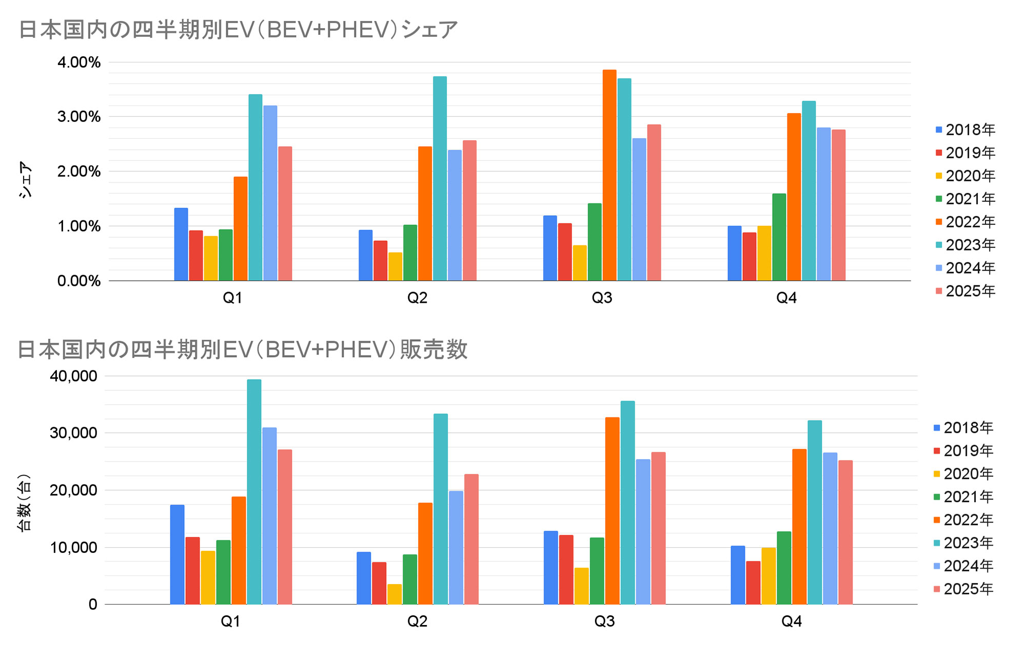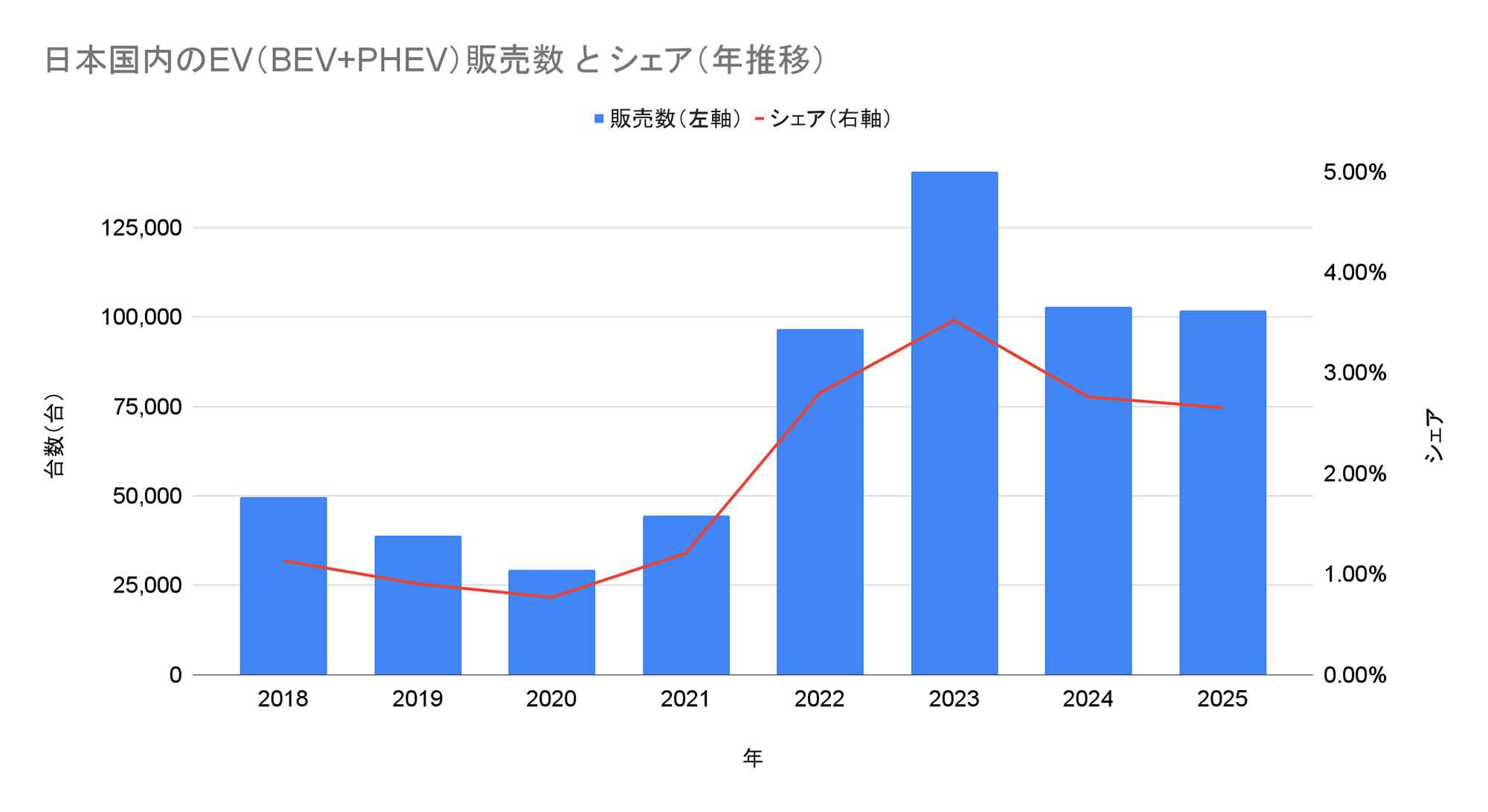 日本国内における電気自動車販売シェア最新情報【2025年12月】トヨタ「bZ4X」が好調持続もEVのシェアは横ばい