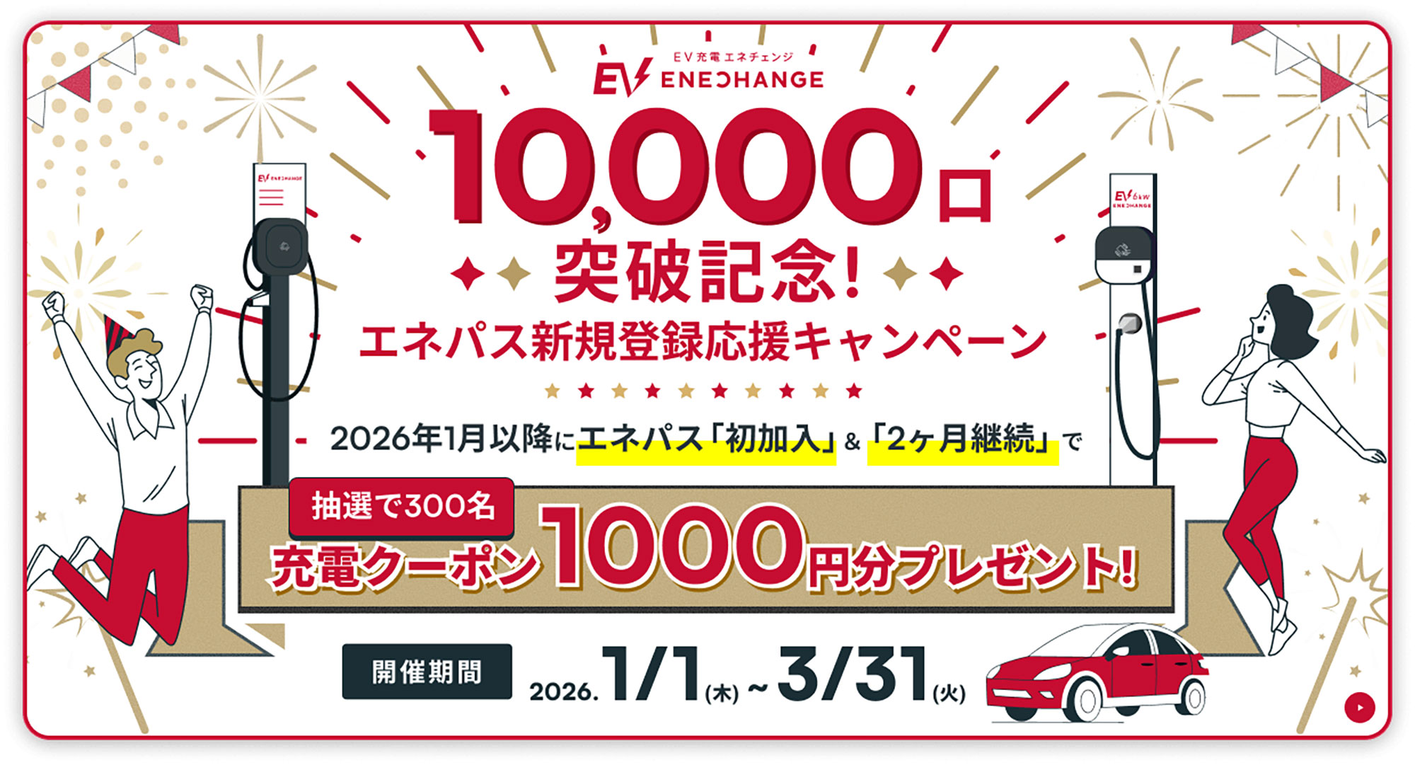 今回のキャンペーンでは、2026年3月31日(火)までに「エネパスに初加入」&「2カ月継続」した人から抽選で300名に、1,000円分の充電クーポンがプレゼントされます。