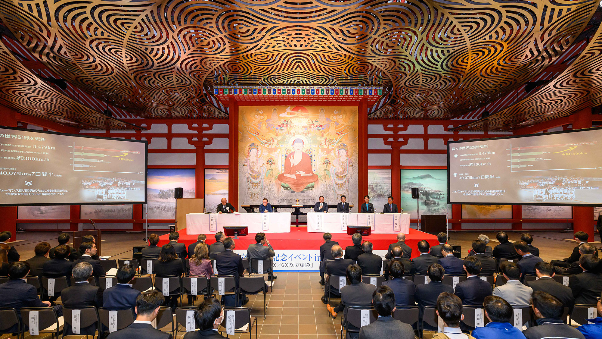 試乗会が終了した午後からはJAIAメンバー各社幹部によるDXおよびGXについての最新情報紹介などを含むトークセッションが行われました。トークセッションの会場は薬師寺の食堂(じきどう)と呼ばれる場所。創建は天平2年(730)頃、度々の火災で焼失し、2017年に再建された際に奉納された「阿弥陀三尊浄土図」が見守る大空間で厳かな空気に包まれたものとなりました。