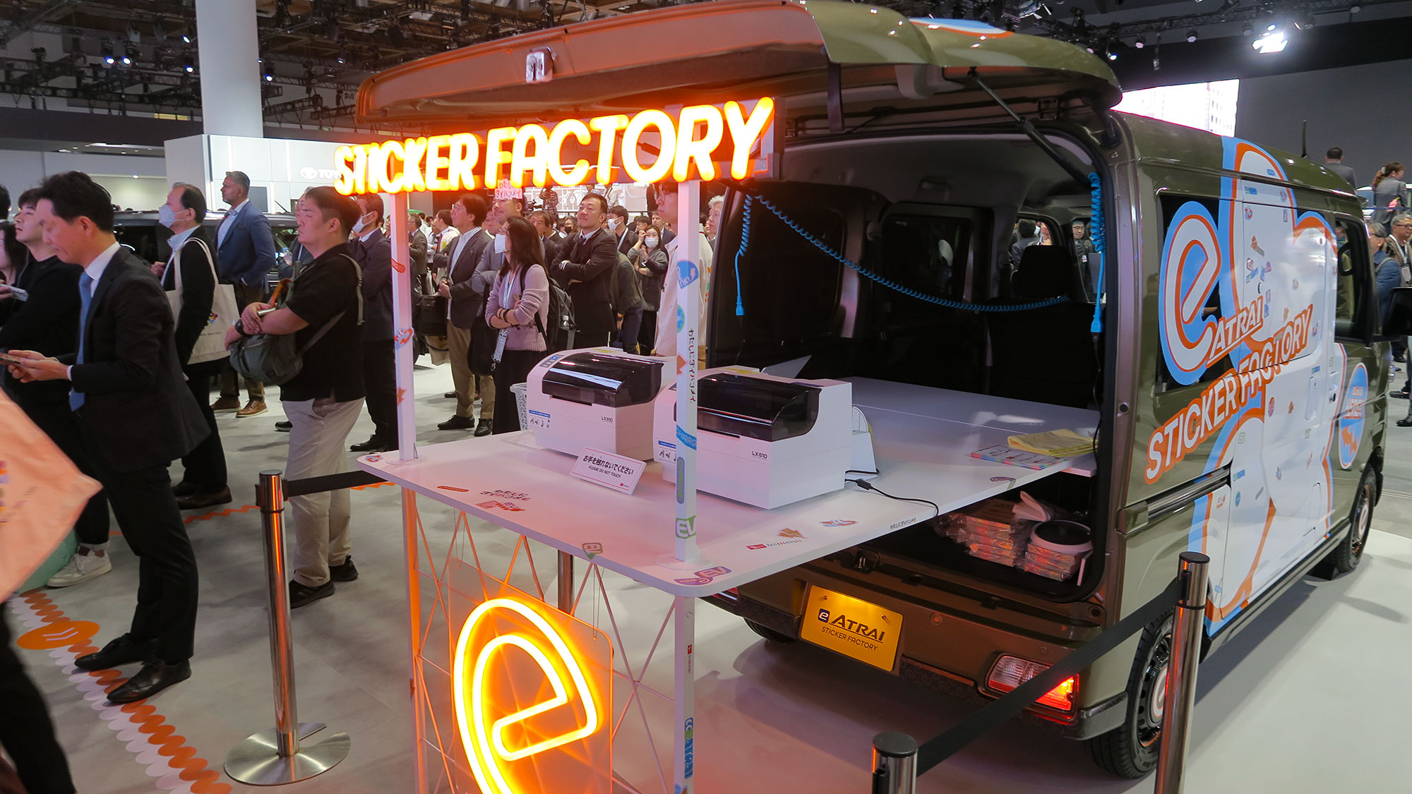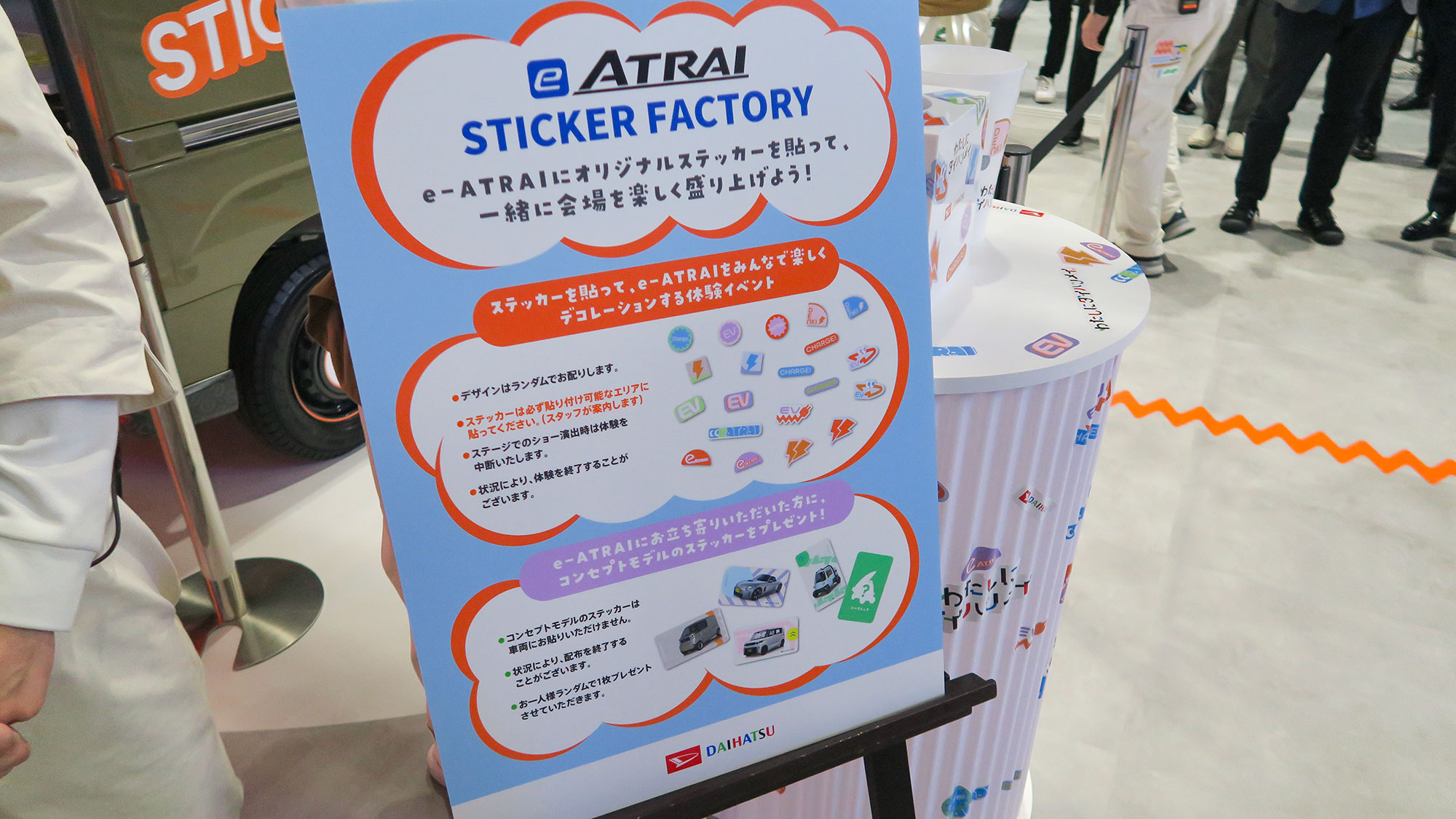 ダイハツブースで気になったのが、電気自動車の「e-ATRAI」をから給電するプリンターでステッカーをプリントしてくれる「STICKER FACTORY」。