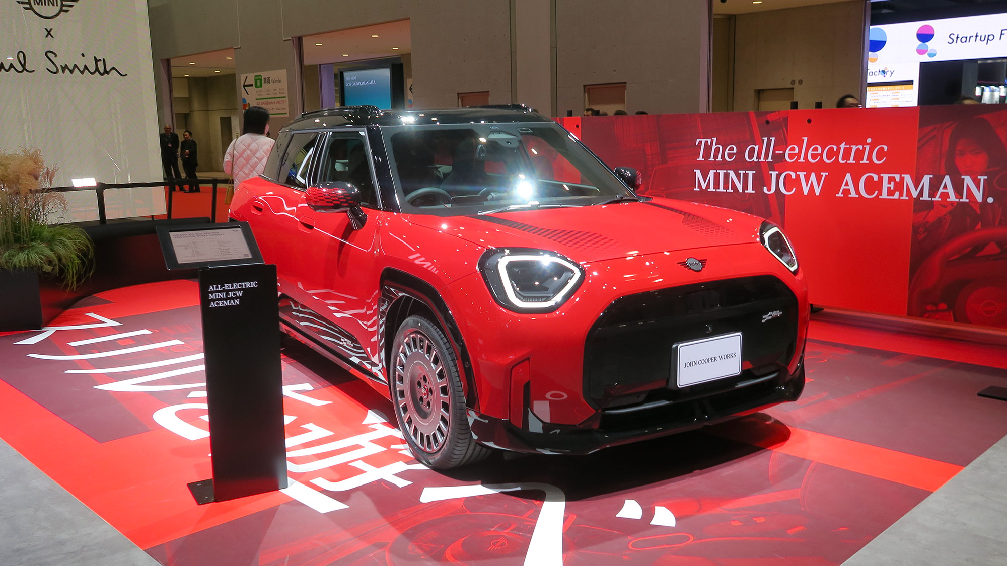 MINIのブースには電気自動車のMINI JCW ACEMAN Eが展示されています。展示車はオプション込みで約688万円と高いけど、運転がとても楽しいEVです。