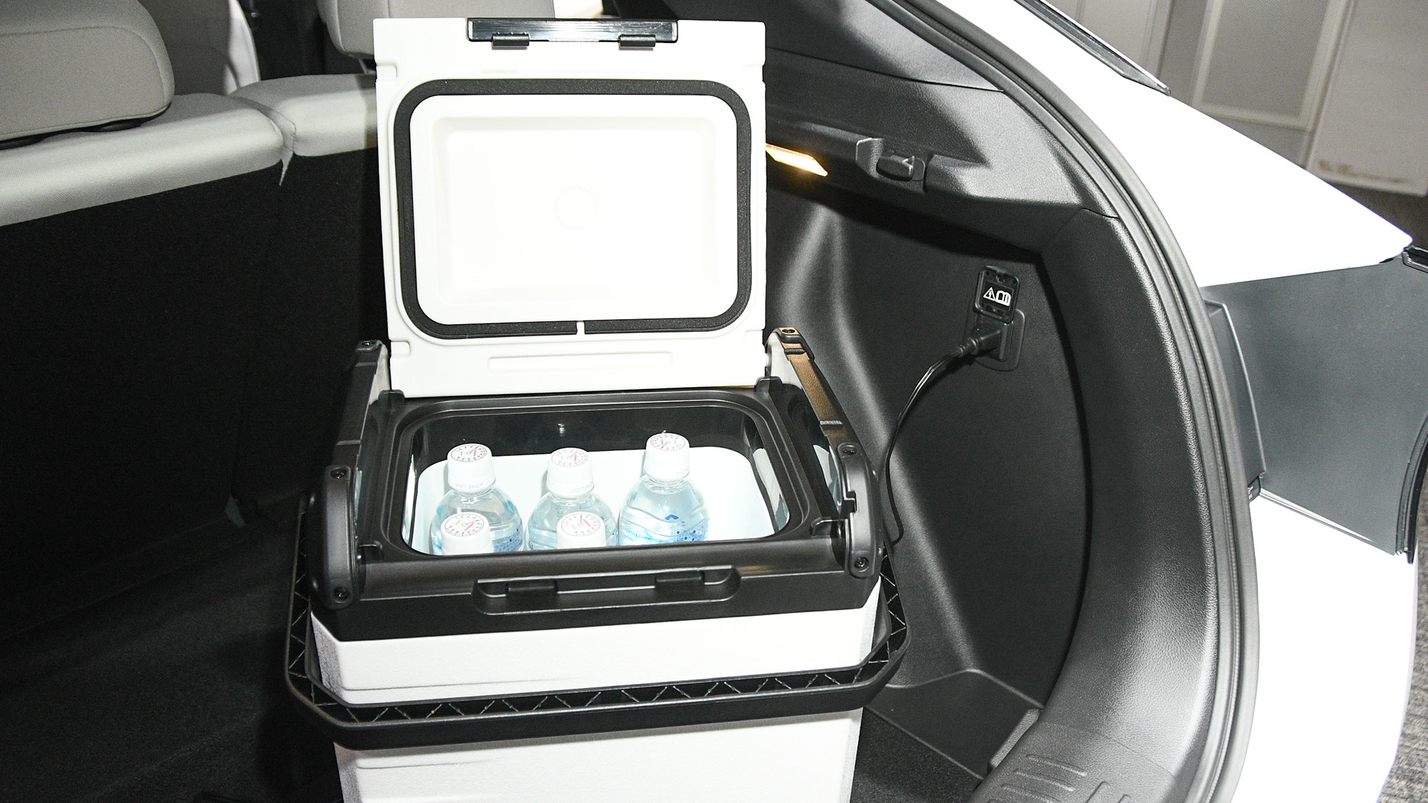 さらにオプションで車内にAC電源のコンセントを取り付けることも可能。この場合はセンターコンソールとラゲッジの2カ所にAC電源ソケットが装備されます。標準装備のAC外部給電コネクターとオプションのAC電源ソケットは別系統のインバーターで電力を供給するため、それぞれから各1500W、合計3000Wの電力を得られるというのがポイントです。これは家庭用30A契約と同等の電力。キャンプなどで、瞬間的な消費電力が大きい電気ケトルとホットプレートを同時に使うこともできます。