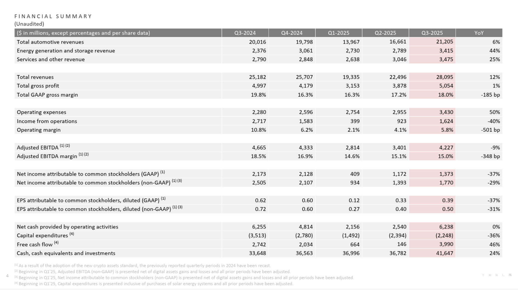 テスラが現地時間の2025年10月22日に、2025年第3四半期(7月~9月)の決算を発表した。過去最高の49万7099台という納車台数によって自動車部門の売上高は212億500万ドルを記録。エネルギー部門も製品展開12.5GWhと伸長して34億1500万ドルの売上高。サービスやその他事業の売上も34億7500万ドルとなり、総売上高は前年同期比12%増の280億9500万ドルで、過去最高の四半期売上とフリーキャッシュフローを達成した。市場の期待を上回ったが、同時に収益性の圧迫という現実も浮き彫りになっている。