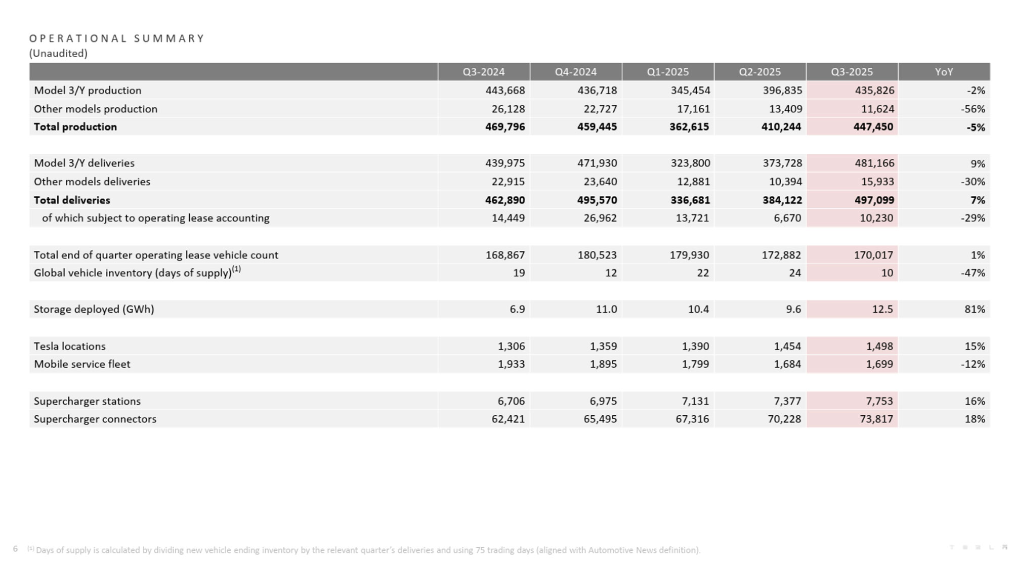第3四半期において、テスラは世界的な車両納入台数で過去最高を達成し、全地域で成長した。また、エネルギー貯蔵製品の展開でも過去最高を記録。この業績により、四半期の売上とフリーキャッシュフローの両方で過去最高を達成。新製品についてはモデルY Lやパフォーマンスを発売、モデル3およびモデルYスタンダードという最も手頃な価格の車両により車両ラインナップを拡大した。