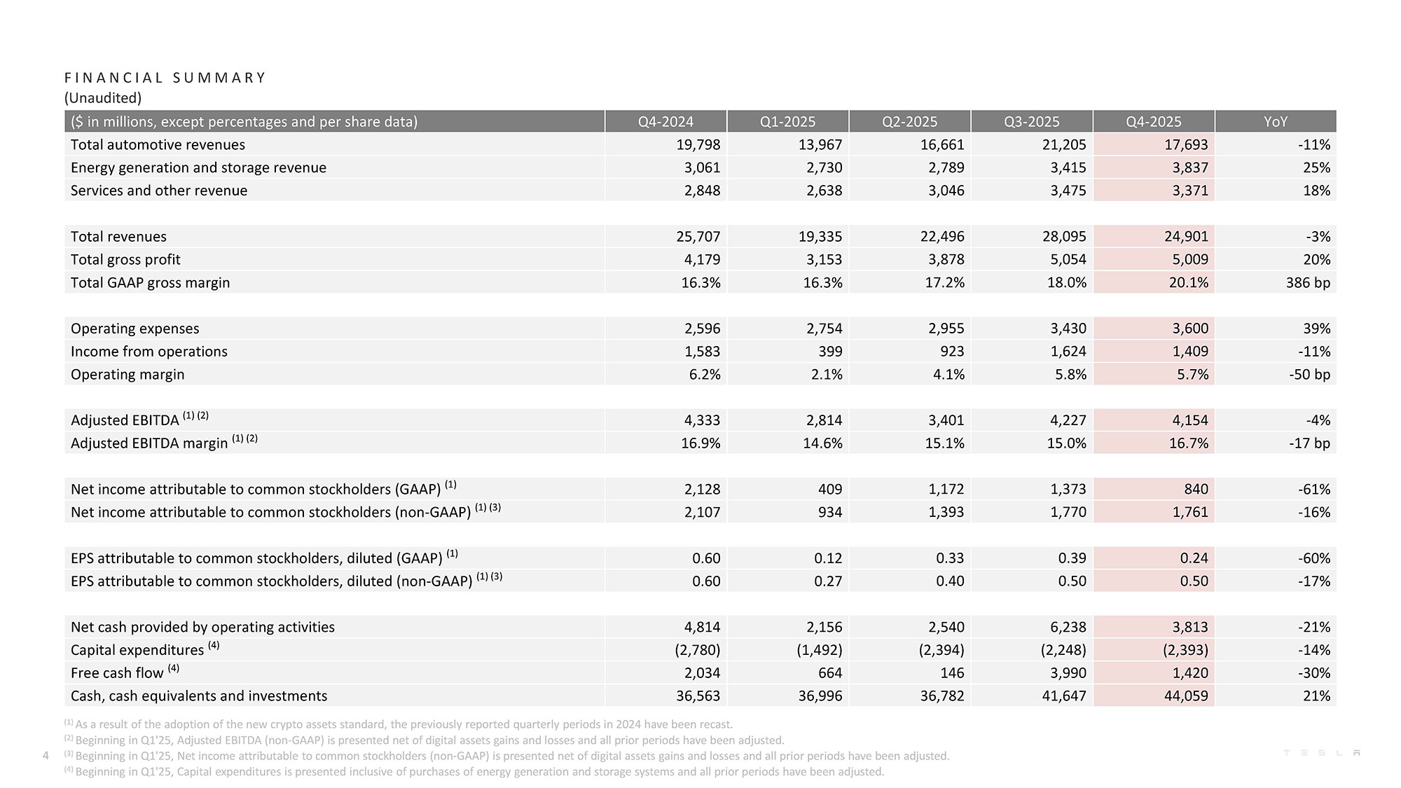 テスラの2025年第4四半期決算は、総売上高が249億100万ドルで前年同期比3%減、自動車部門の売上は176億9300万ドル(前年同期比11%減)、エネルギー部門は38億3700万ドル(前年同期比25%増)、サービスやその他事業の売上は33億7100万ドルとなった(前年同期比18%増)。調整後EPSは0.50ドルとなり、市場予想を上回った。営業利益は14億900万ドルで前年同期比11%減、調整後純利益は17億6100万ドルで前年同期比16%減となった。フリーキャッシュフローは前期の39億9000万ドルから14億2000万ドルに減少している。