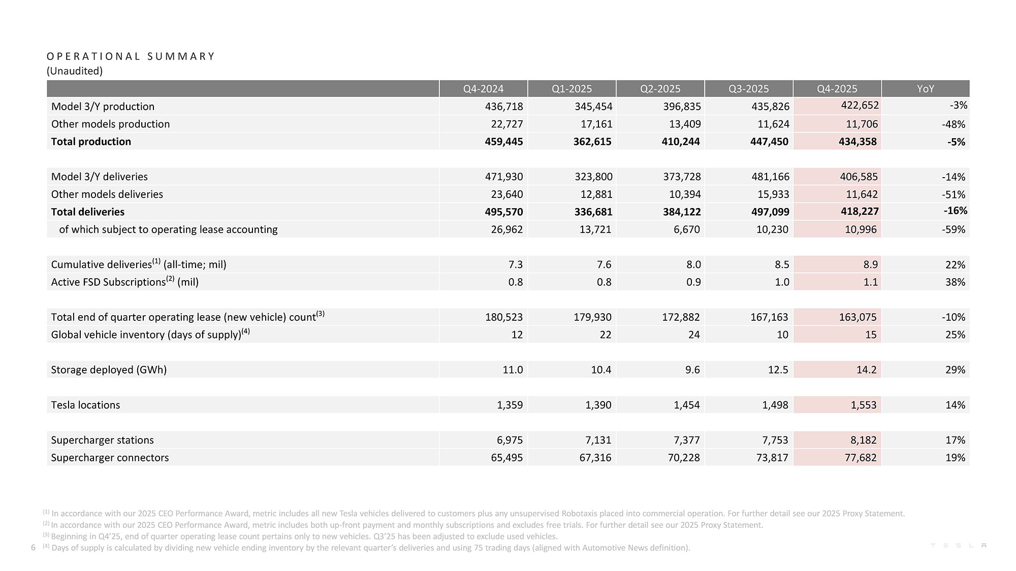 2026年にはインフラへのさらなる投資を進め、車両(サイバーキャブ)、人型ロボット、エネルギー貯蔵製品、バッテリー製造にわたる新生産ラインの本格稼働を開始し、将来の成長を支えていくとしている。
