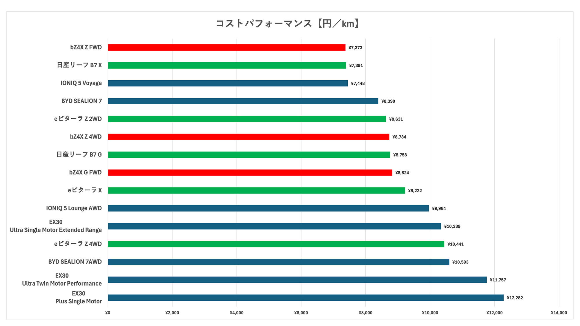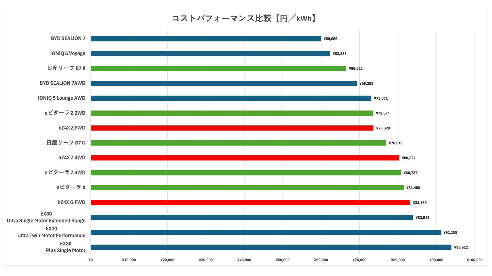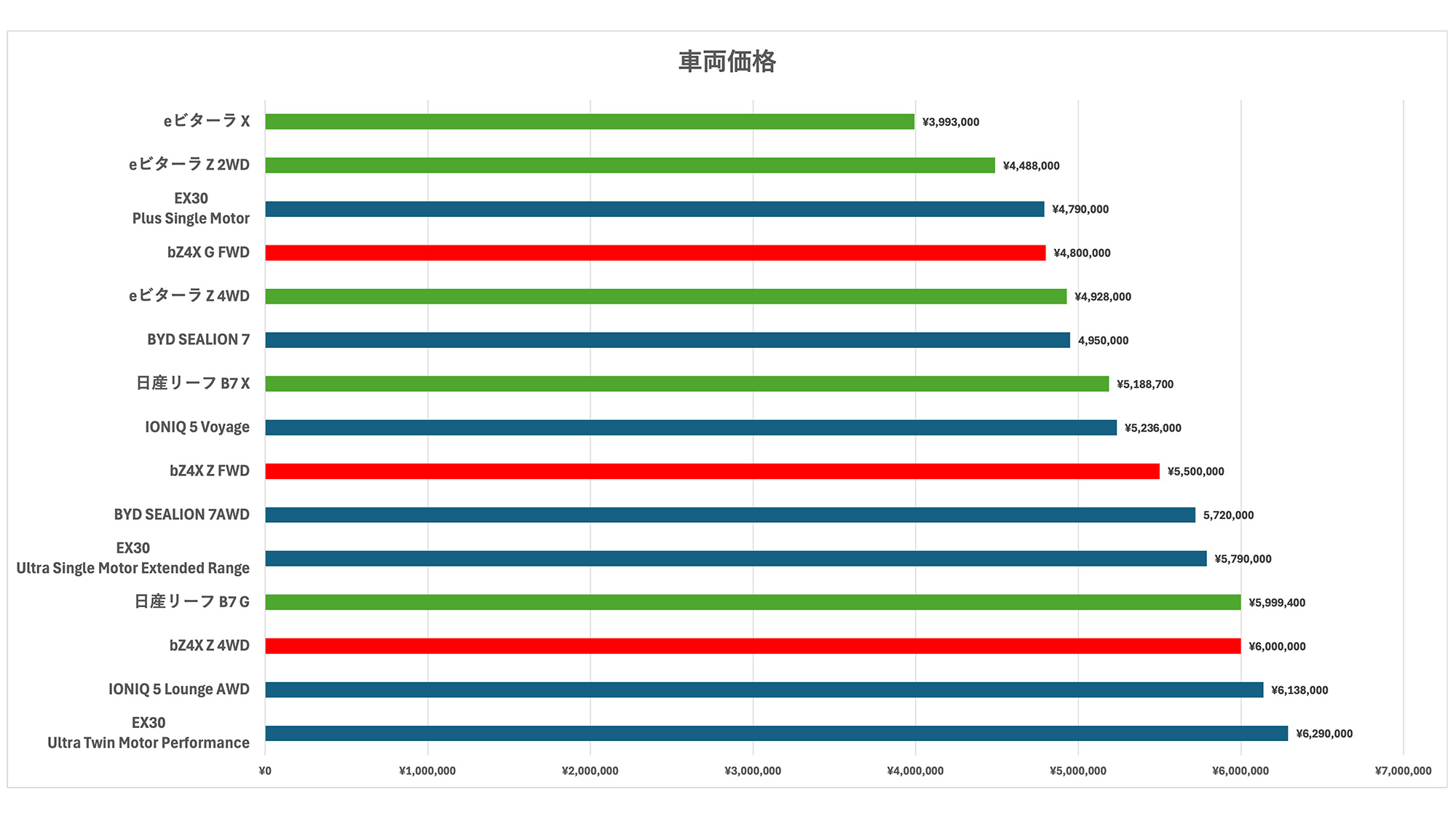 eビターラはちょっと車格が異なりますが、先に引き合いに出したのでご参考まで。上から価格順に並べて、bZ4Xを赤。スバルと日産、日本メーカーの車種を緑に。輸入ブランドEVのうち、ボルボEX30、BYD SEALION 7、ヒョンデ IONIQ 5を比較対象としています。