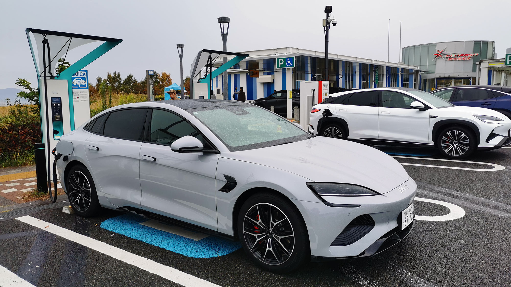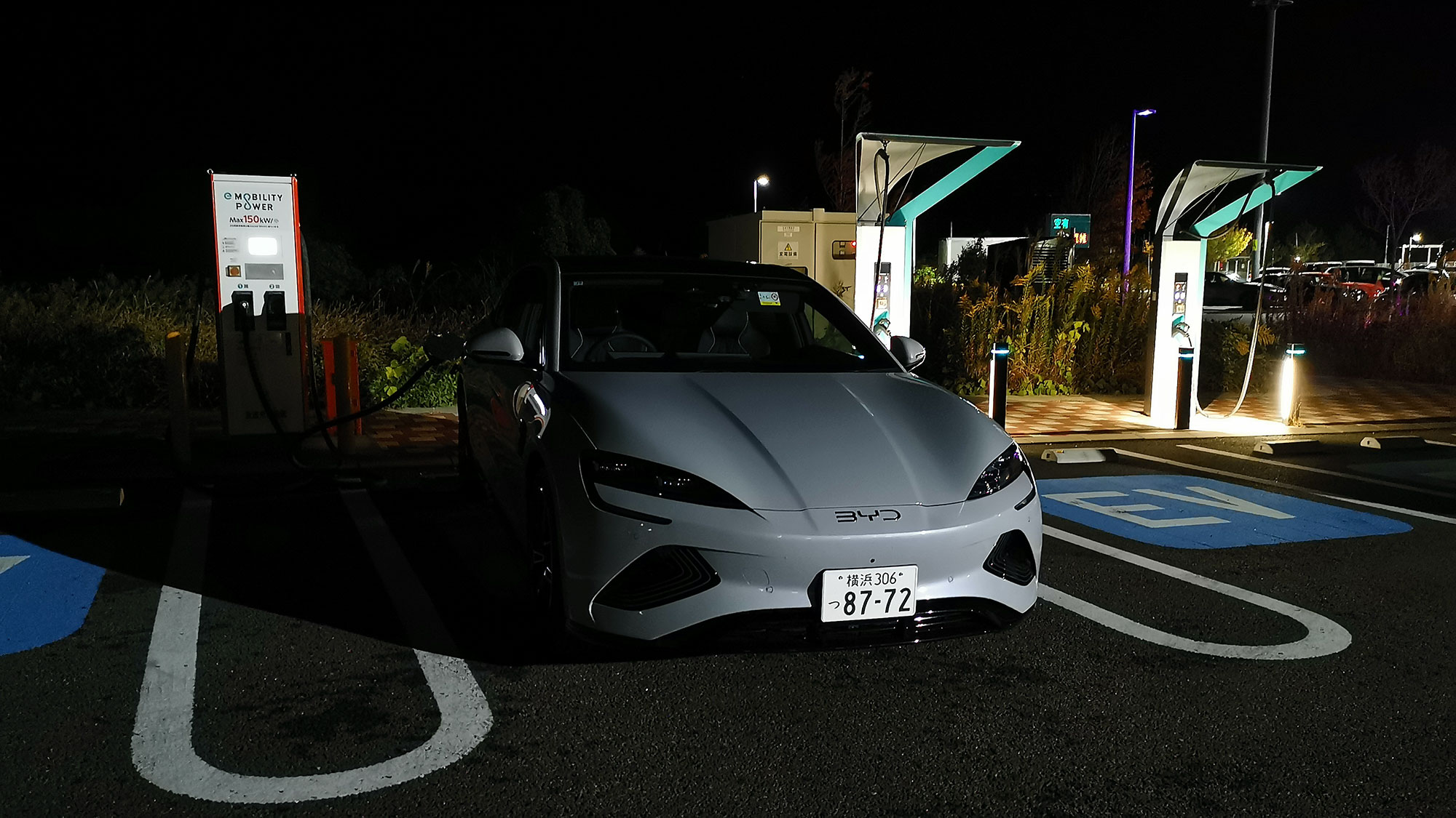 駿河湾沼津SAにはABB製の150kW器が1基(2口)、ニチコン製の90kW器が4基(4口)設置されています。シールは90kW器側に駐車しました。駿河湾沼津SAまでの走行距離は106kmで、到着時のSOCは30%。横浜スタート時のSOCは55%で「25%」の電力を使用したことになるので、単純計算だと100%で424kmの航続距離です。カタログ値の航続距離は575kmですが、大人3人が乗車して普通にエアコンを使用した数値ですから、実用的に何の問題もない航続距離性能といっていいでしょう。