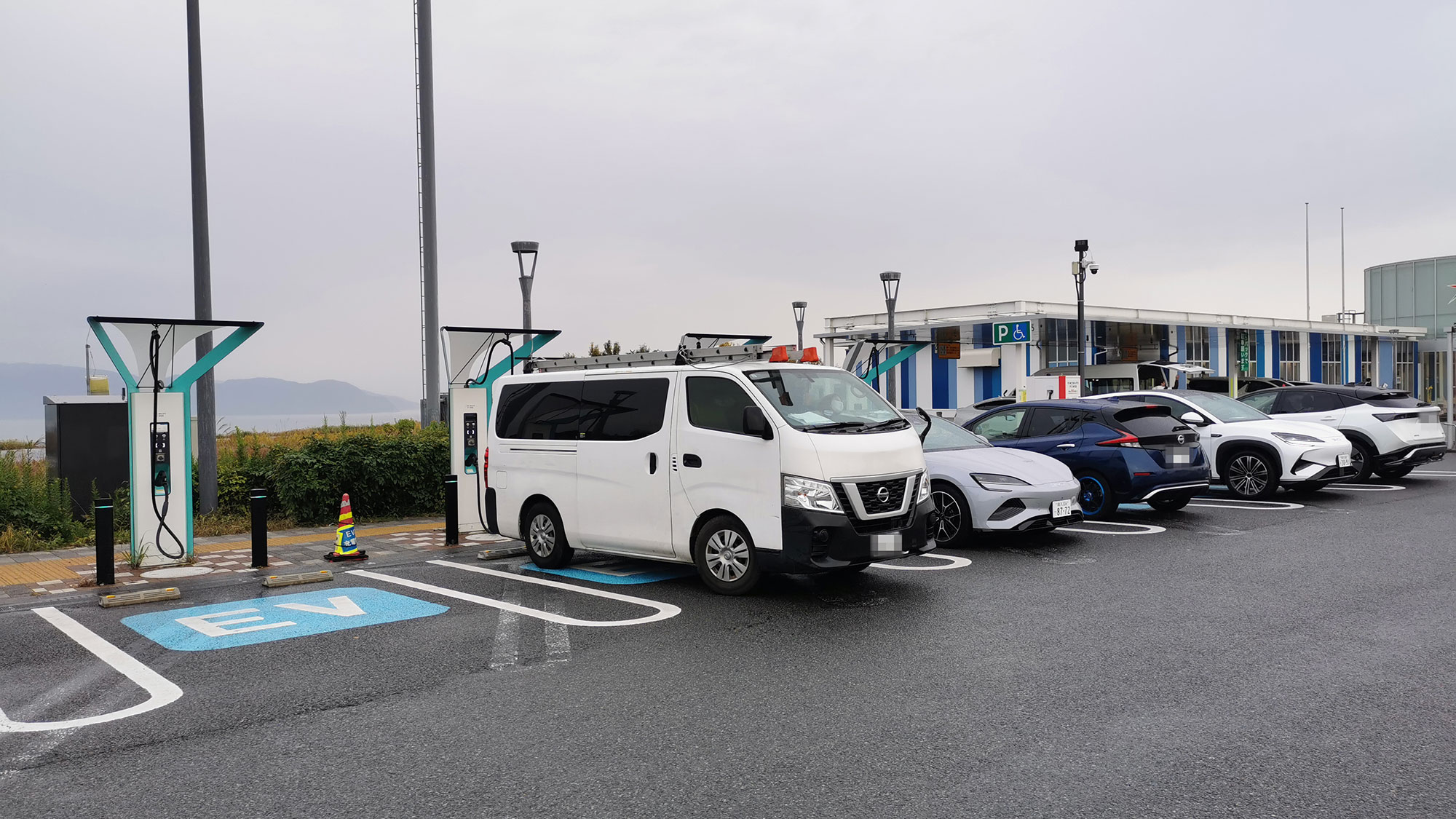 実際に目にして残念だったのが、充電用の駐車スペースにキャラバンが止まっていたこと。もしかしたらコンバートEVかな? と思って確認しましたが充電ケーブルは接続されていませんでした。たしかに駐車場は混雑していましたが、一般車の駐車枠がすべて埋まっていたわけでもなく、運転手は不在でしたが、助手席には女性が乗っていました。