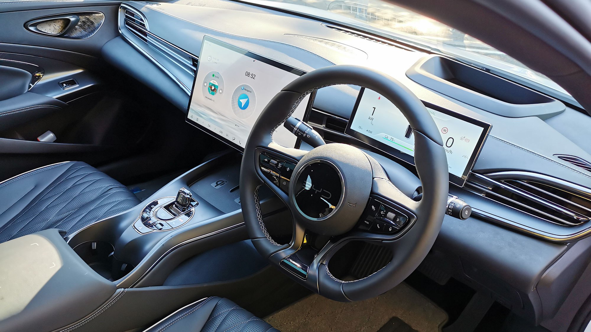 シールはシーライオン 7と同様にセンターモニターが縦と横に回転する機構を持っています。この機構はギミック的要素が強いと思っていたのですが、筆者のドライビングポジションだと横位置でモニターを使ったときに、右下部分がステアリングで隠れてしまうのです。これを縦位置にすると画面すべてが視界に入り、モニターが使いやすくなります。大型モニターだからこそ、縦位置でも使えることが大切なのだと気付きました。