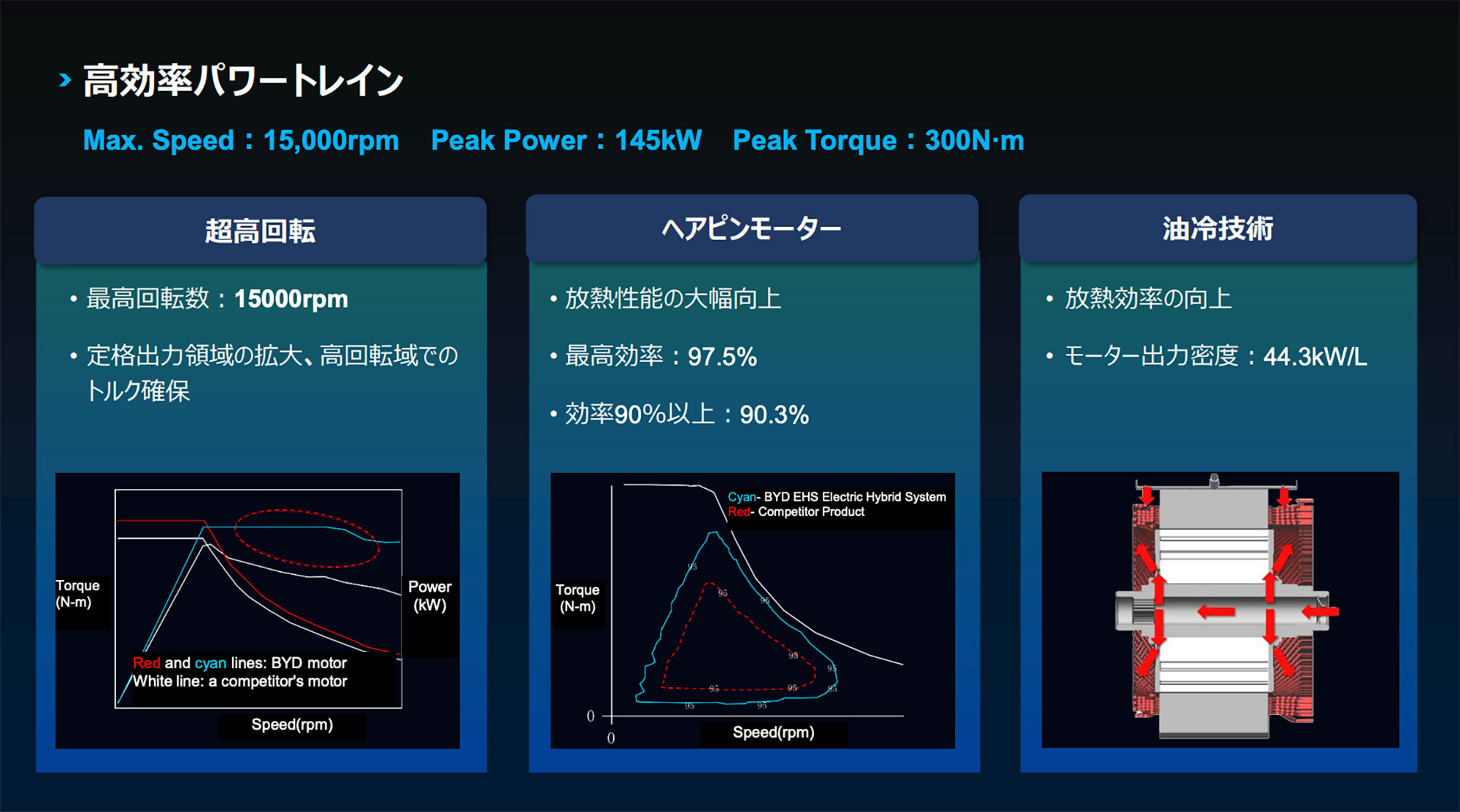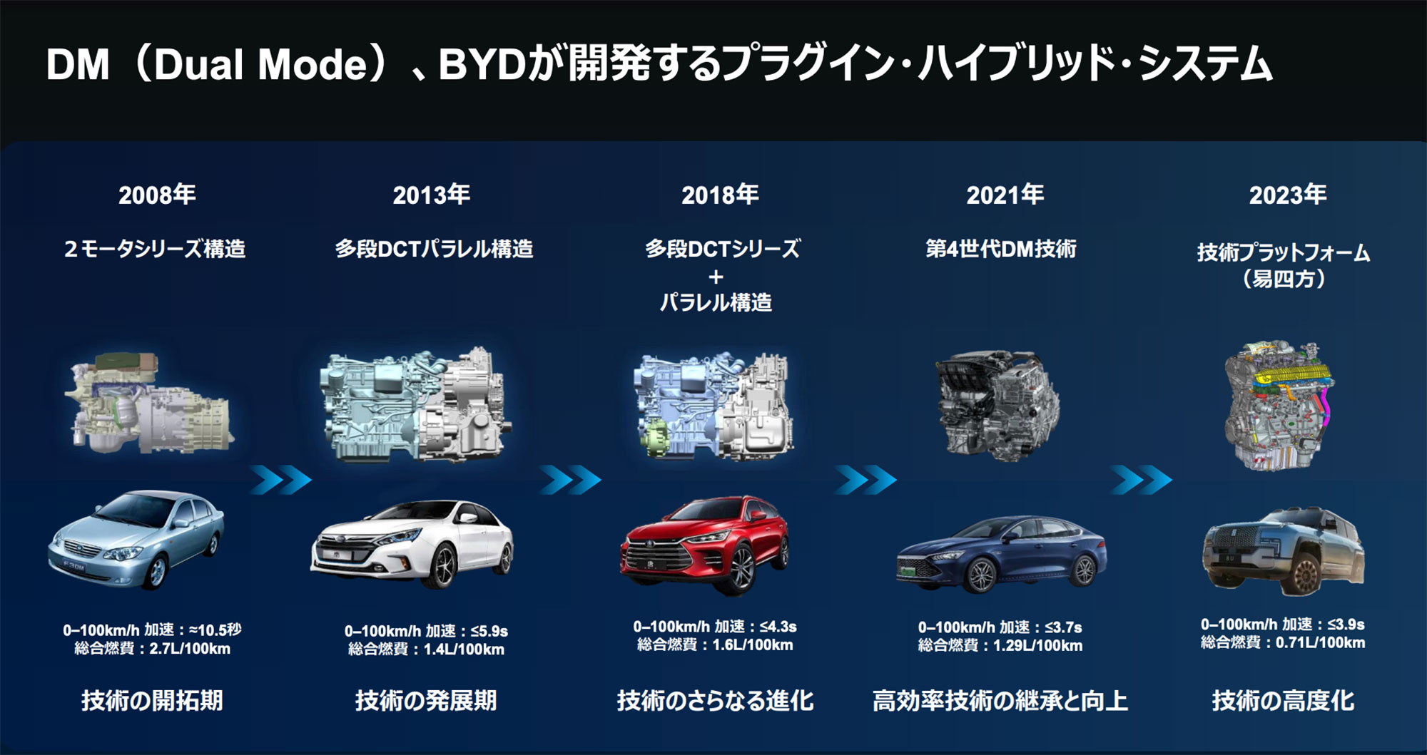技術説明に登壇したルー氏は、これまでトヨタやホンダのHEVや日産のe-powerなど、日本のハイブリッドシステムを熱心に研究してきたと明かしました。BYDは2008年に世界で最初に量産型のPHEVを発売しており、この時は2モーターHEVシステムでしたが、2010年代にはドイツメーカーが主に採用する多段ギアボックスとDCT(デュアルクラッチ)を使ったシングルモーターシステムに移行した時期もあったようです。