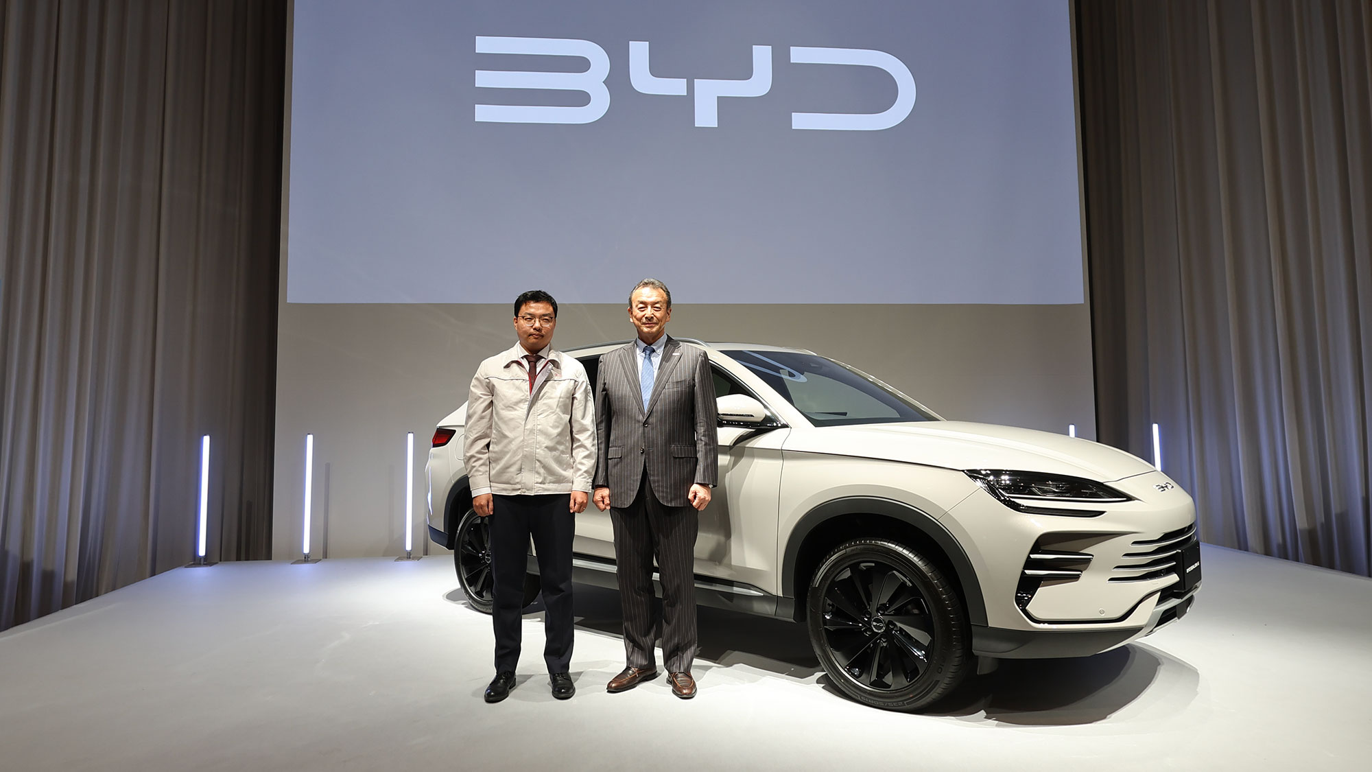 発表会で登壇したルー氏(左)と、BYDオートジャパンの東福寺社長。
