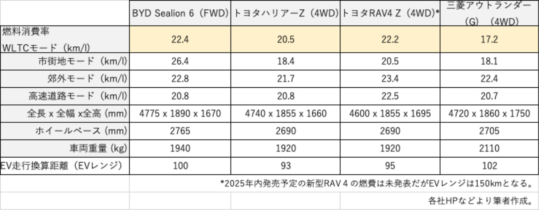ルー氏はインタビューで、「DM-iの一番のコンセプトは低燃費」と語りましたが、WLTC総合燃費22.4km/Lは同クラスのトヨタハリアーPHEV(20.5km/L)や現行RAV4 のPHEV(22.2km/L)を上回り、特に市街地モードでは26.4km/Lと優れています(ハリアーとRAVのPHEVはリアに小型のモーターを持つ4WDだが、車両重量は1920kgでSealion 6(1940kg)とほぼ同じ)。