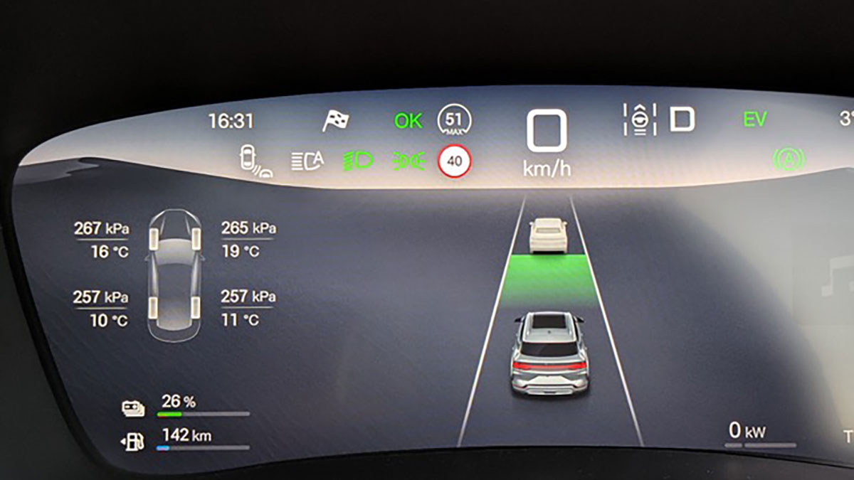SOC 25%以下ではEV走行モードには入らないという説明でしたが、乗り込んだ時のバッテリー残量は24%。登坂を始めるとインパネには確かに「HEV」の表示が出ますが、エンジン音はほとんど聞こえず、「本当にエンジンかかっているの?」と思うほど室内は静かです。アクセルを踏み込むとアトキンソンサイクルのエンジンが大きな唸りを立てる、これまで体験した国産HEVとは様子が違います。