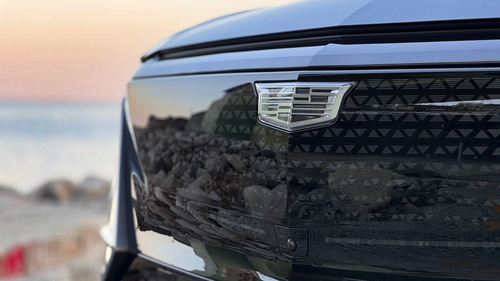 リリックのエクステリアデザインを見ていきます。フロントバンパーの外側に縦に並んだライトですぐにキャデラックファミリーであることが分かります。その外側はDRL(デイタイム・ランニング・ライト)、内側の上部がロービーム、下部がハイビームという構成になっています。ウインカーはそれらの上に水平に配置されています。ライト類の内側のブラックパネルの中央にはクリアタイプのキャデラッククレスト(紋章)が鎮座しています。このクレストはリリックから始まったBEV専用デザインです。