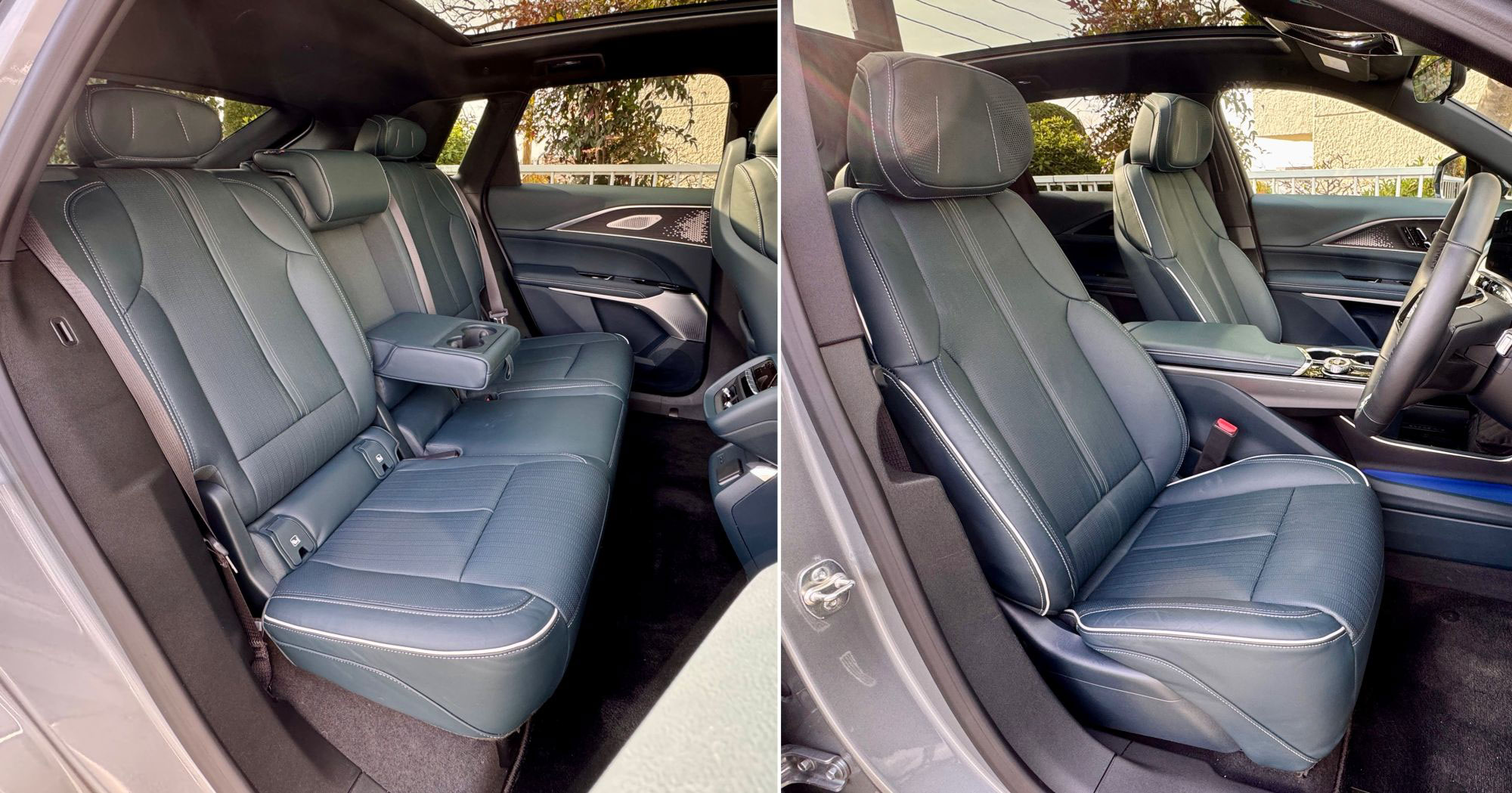 少し緑がかった黒のレザーシートはこの車両に唯一設定されているオプションである「フルレザー」インテリア(税込65万円)です。ドアパネルにある紫から黒へのグラデーションのような「KOMOREBI(コモレビ)」もこのオプションに含まれます。ヘッドレストにスピーカーが内蔵されているフロントシートは、ヒーター、ベンチレーション、マッサージ機能付きで、座るとふかっと沈み込み、このクルマのおおらかさを感じるポイントです。