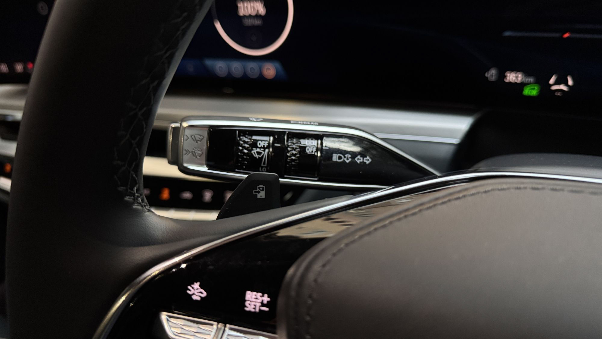 ロックトゥロックが約3.5回転とスローなギヤ比のステアリングとアクセルペダルはしっとり重めです。パドルはステアリングの左側にのみあり、回生ブレーキを操るためのものです。このパドルの操作感とそれに伴う回生具合の制御が巧みでした。まさに指で操作する第2のブレーキペダルという感じで、ストローク量はペダルよりももちろん圧倒的に少ないのですが細かい減速度の調整ができ、しかもテスラのような「0G停車」も可能です(洗練度と完成度はテスラに一日の長あり)。