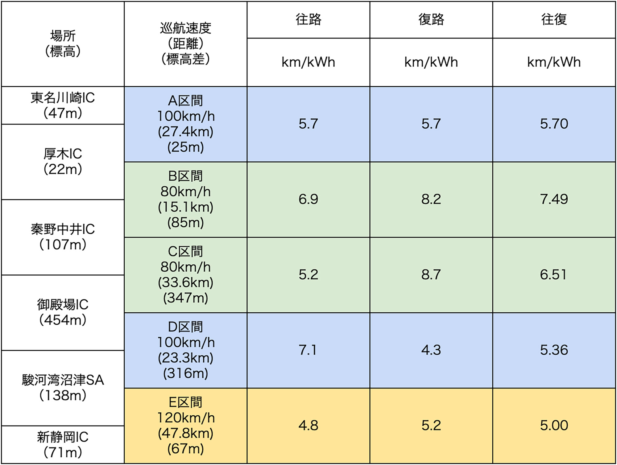 往復では80km/hが6~7km/kWh台で、ここでもより平坦なB区間の方が良い電費を記録しています。100km/hと120km/hは5km/kWh台でした。120km/hがギリギリ5.00km/kWh台で踏み止まったのは、4.04km/kWh だったN-VAN e:よりも全高が低いことが効いているのだと思います。